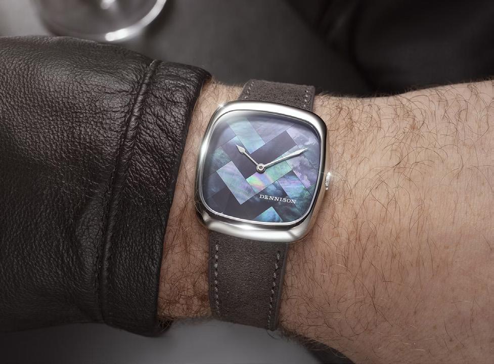 El reloj mantiene la caja característica de Dennison, con dimensiones de 37 mm por 33,5 mm en forma de cojín/TV y un grosor de apenas 6,05 mm, impulsado por un movimiento suizo Ronda Quartz 1032. Lo que distingue a esta edición es su esfera de marquetería elaborada con madreperla australiana, diseñada por Emmanuel Gueit. Cada pieza de la esfera está ensamblada a mano, creando un juego de tonos oscuros y claros que cambia con la luz y otorga al reloj una presencia sofisticada, pero sin caer en la rigidez de los relojes formales tradicionales.