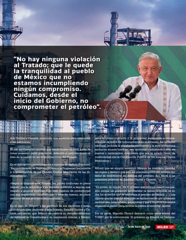 tiene el dominio directo y la propiedad inalienable e imprescriptible de todos los hidrocarburos en el subsuelo del territorio nacional, incluida la plataforma continental y la zona económica exclusiva situada fuera del mar territorial y adyacente a este, en mantos o yacimientos, cualquiera que sea su estado físico, de conformidad con la Constitución Política de los Estados Unidos Mexicanos.» Afirmó que en ningún momento México ha intentado cambiar las reglas y destacó que solo los planteamientos del sexenio anterior se modificaron en defensa del petróleo, aun frente a las presiones políticas de Estados Unidos y Canadá. “Es motivo de orgullo, fue lo primero que hicimos: resistir esa presión porque los gobiernos neoliberales ya habían aceptado en todos los acuerdos que se negociara el petróleo de México. (…) Les dijimos que los tratados anteriores se habían suscrito por gobiernos neoliberales, neoporfisitas, entreguistas y que a nosotros nos estaba eligiendo el pueblo para cambiar la política económica”, apuntó. Por su parte, Marcelo Ebrard descartó crisis entre socios del T-MEC por la controversia. El gobierno de México es “optimis24 DE JULIO DE 2022