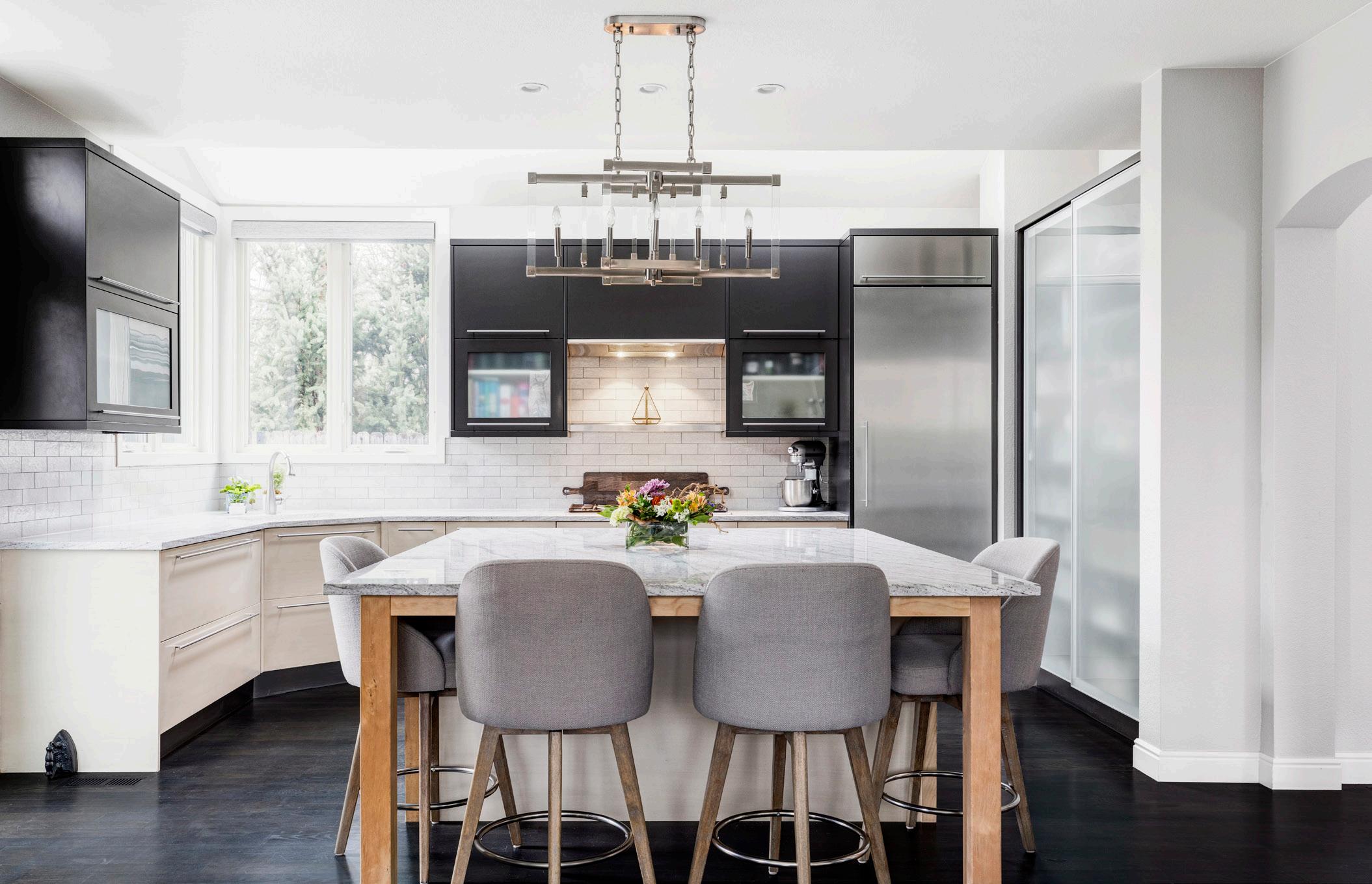 Modern grandeur is celebrated at every turn in this Wash Park residence. A curation of neutral finishes harmonize together, ranging from soft white walls and warm wood flooring to slate black railing and window casing. This bold example of contrast is explored on a showstopping floor-toceiling fireplace in the living area and further within the spa-like primary suite, where luxurious hexagonal tile grounds the space in depth.