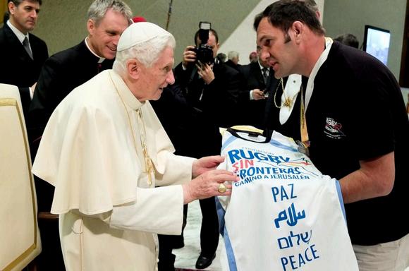 Juan Bautista Segonds siendo recibido en el Vaticano por Benedicto XVI en Roma, en el 2012 (ElPapalonombró“Mensajerodelapaz”porsufundación“RugbySinFronteras”)