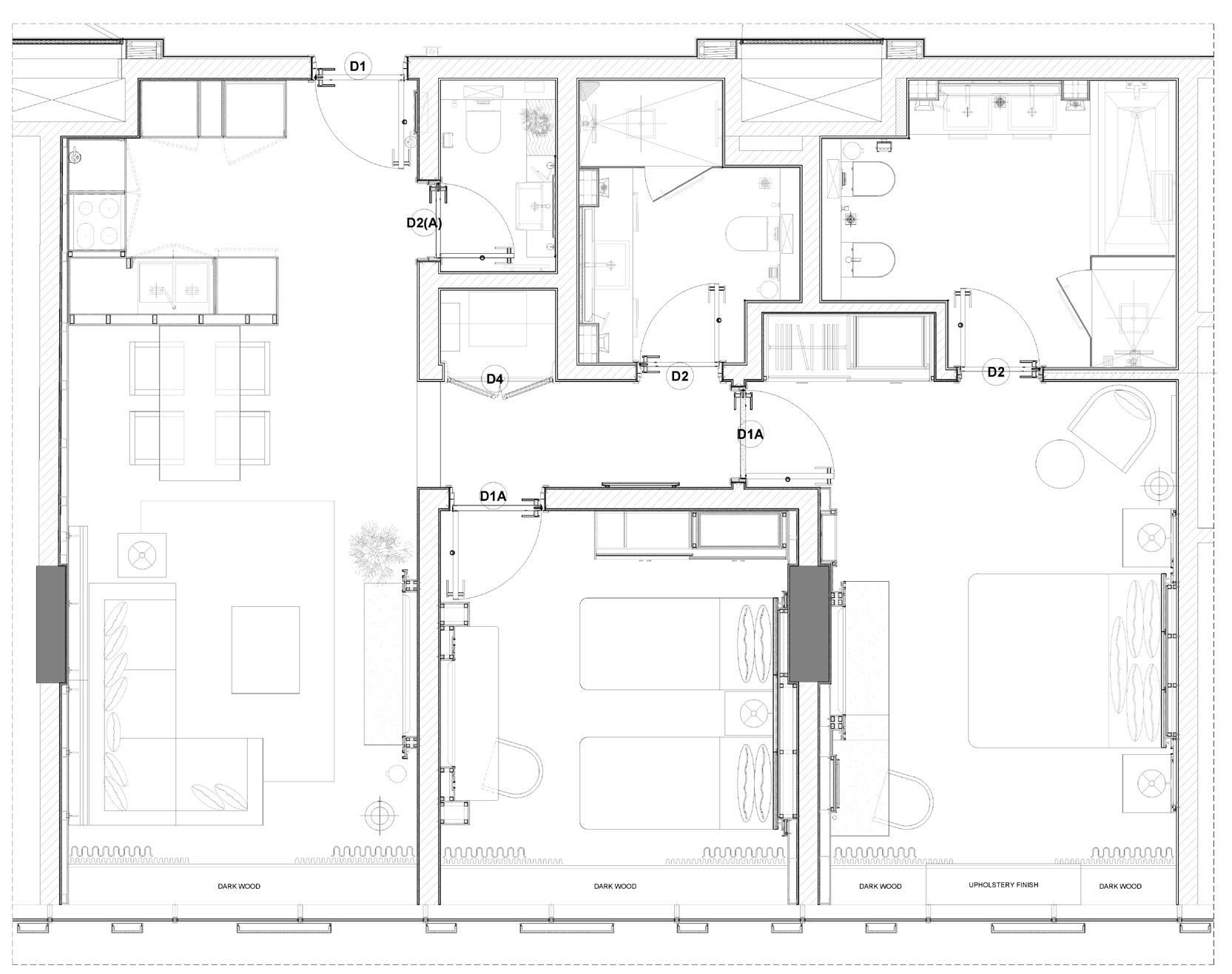 Designed for the needs of the busy modern-day traveler as well as long-term visitors the rich yet subtle color tones of the essential décor, the comfortable, well-appointed guest rooms, and the signature details create a refined and soothing atmosphere. Each room is designed as suit with living room, bedrooms, and kitchenette. Total number of rooms is 165.
