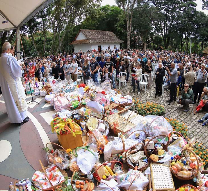 cestas com alimentos à igreja para serem abençoados pelo padre. Esses alimentos são geralmente consumidos na refeição do Domingo de Páscoa, num gesto de partilha e celebração.