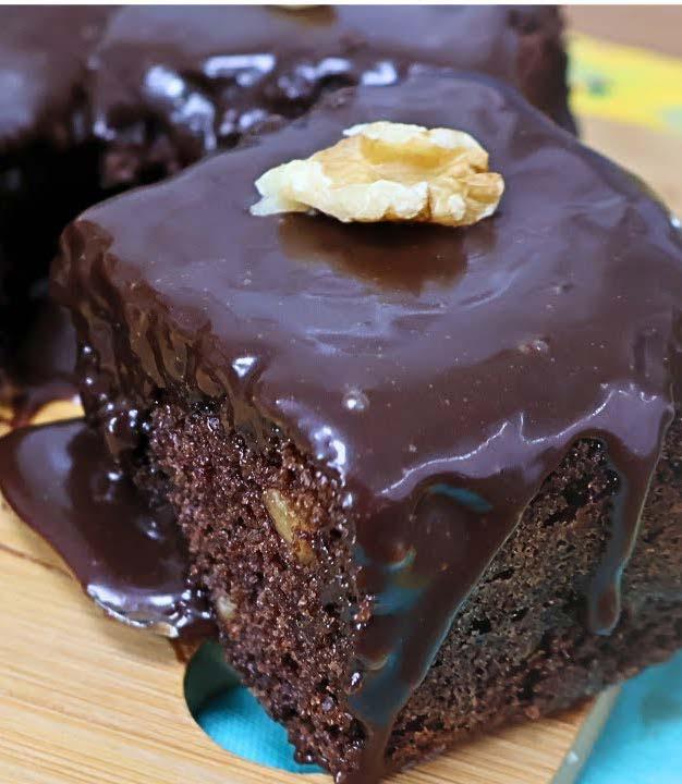 Pré-aquecer o forno a 180°C. Colocar a farinha, o açúcar, o cacau e o fermento numa recipiente grande e misturar com uma vara de arames. Juntar o óleo, o leite e a essência de baunilha e misturar. Envolver as nozes no preparado anterior. Verter a massa para uma forma forrada com manteiga e farinha e levar ao forno durante cerca de 40 min até o palito sair seco. Deixar arrefecer e desenformar. Para a cobertura, juntar todos os ingredientes secos numa tacho e juntar um pouco do leite. Misturar