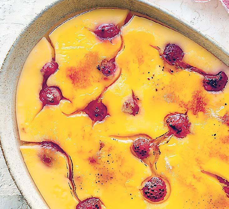 Espalhar numa travessa as framboesas e cobrir as framboesas com o creme.