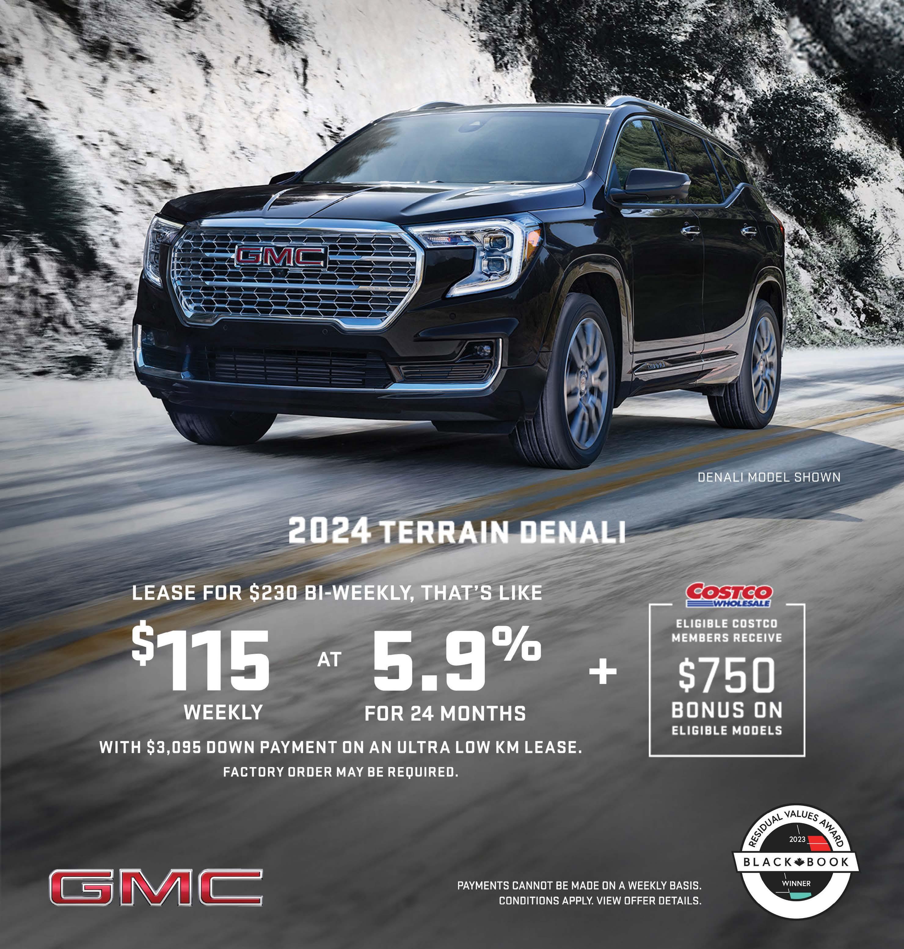 TERRAIN LEASE: Offer available to qualified retail customers in Ontario on select new and previously unregistered 2024 Terrain Denali models leased between March 1, 2024, to April 1, 2024. On approved credit. Lease based on suggested retail price of $46,548 [includes $2,000 freight; $100 A/C charge; up to $699 dealer administration fee; as well as all other applicable fees, levies and duties (all of which may vary by retailer)] towards the lease of an eligible 2024 Terrain Denali model. Bi-weekly payment is $230 for 24 months at 5.9% lease rate (5.9% APR) with $3,095 down payment. 52 biweekly payments required. Total lease obligation is $15,032. Option to purchase at lease end is $36,182. 16,000-kilometer allowance; charge of $0.20/km for excess kilometers, based on an ultra low mileage lease. License; insurance; registration; and applicable taxes are extra. $3,400 down payment, lien registration fee (up to $159.53), $0 security deposit and first biweekly payment due at lease inception. Dealers are free to set individual prices. Factory order may be required. Limited time offer which may not be combined with certain other offers. General Motors of Canada Company may modify, extend or terminate offers for any reason, in whole or in part, at any time, without notice. Conditions and limitations apply. See dealer for details. These offers may not be redeemed for cash and may not be combined with certain other consumer incentives. Void where prohibited. Chargeable paint costs may vary depending on the vehicle/colour. See Dealer for full program details. The $115 weekly payment equivalent is shown for informational purposes only. Payments cannot be made on a weekly basis. * To qualify for the $750 Costco Member-Only Bonus, you must be a Canadian resident holding a valid driver’s license, have been an active Costco member as of February 29th, 2024, or earlier and must: (1) Register with Costco to receive your non-transferable Authorization Number; (2) Present the Authorization Number to a participating dealer; (3) Retail purchase, finance or lease an eligible new or demonstrator 2023 (in-stock) Acadia, 2024 Terrain, 2024 Yukon, and 2024 Yukon XL, delivered from March 1, 2024 – April 30, 2024. Factory order or dealer trade may be required. Bonus is deducted after taxes are applied to the vehicle purchase price. The purchase or lease of a vehicle does not qualify for the calculation of the Costco Executive Membership 2% Reward. Offer may not be redeemed for cash. Conditions and limitations apply to this limited time offer. See participating dealer for details. For full program details and for any applicable exclusions see a participating dealer or costcoauto.ca. Offer is valid at participating authorized GM Canada dealers. Offer available in Canada only. Offer is subject to change without notice. Void where prohibited. Costco and its affiliates do not sell automobiles nor negotiate individual transactions. ®: Registered trademark of Price Costco International, Inc. used under license. 3000 Woodchester Drive, Mississauga | 905-828-2221 | applewoodauto.com Falamos português | Tony Carvalho | cell: 416.723.2431 | tcarvalho@applewoodauto.com