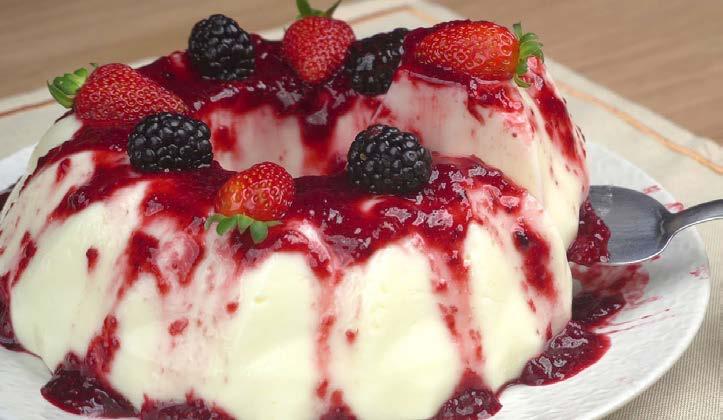 lhas de gelatina escorridas e mexer. Bater as natas até ficarem em chantilly e bater as claras em castelo. Adicionar o chantilly à mistura do coco, envolver bem e juntar as claras em castelo e envolver levemente. Untar uma forma com óleo, colocar esta mistura e levar ao frigorífico durante 5 horas Na hora de servir, desenformar e regar com o doce de frutos vermelhos. Bom apetite!