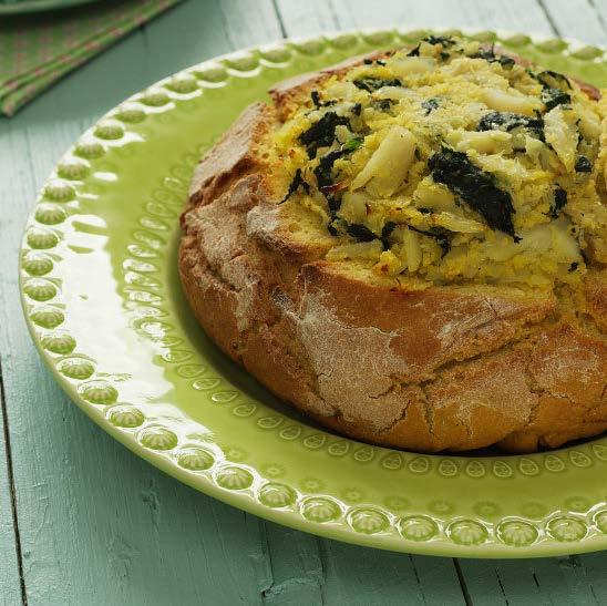 Adicionar o miolo da broa esfarelado com o bacalhau, e juntar as azeitonas picadas e a salsa picada temperar com sal e pimenta, deixar saltear durante 5 minutos, e regar com mais um pouco de azeite. Colocar esta mistura na broa tapar e levar ao forno a 200 graus durante 10 minutos. Pode acompanhar com legumes salteados. Bom apetite!