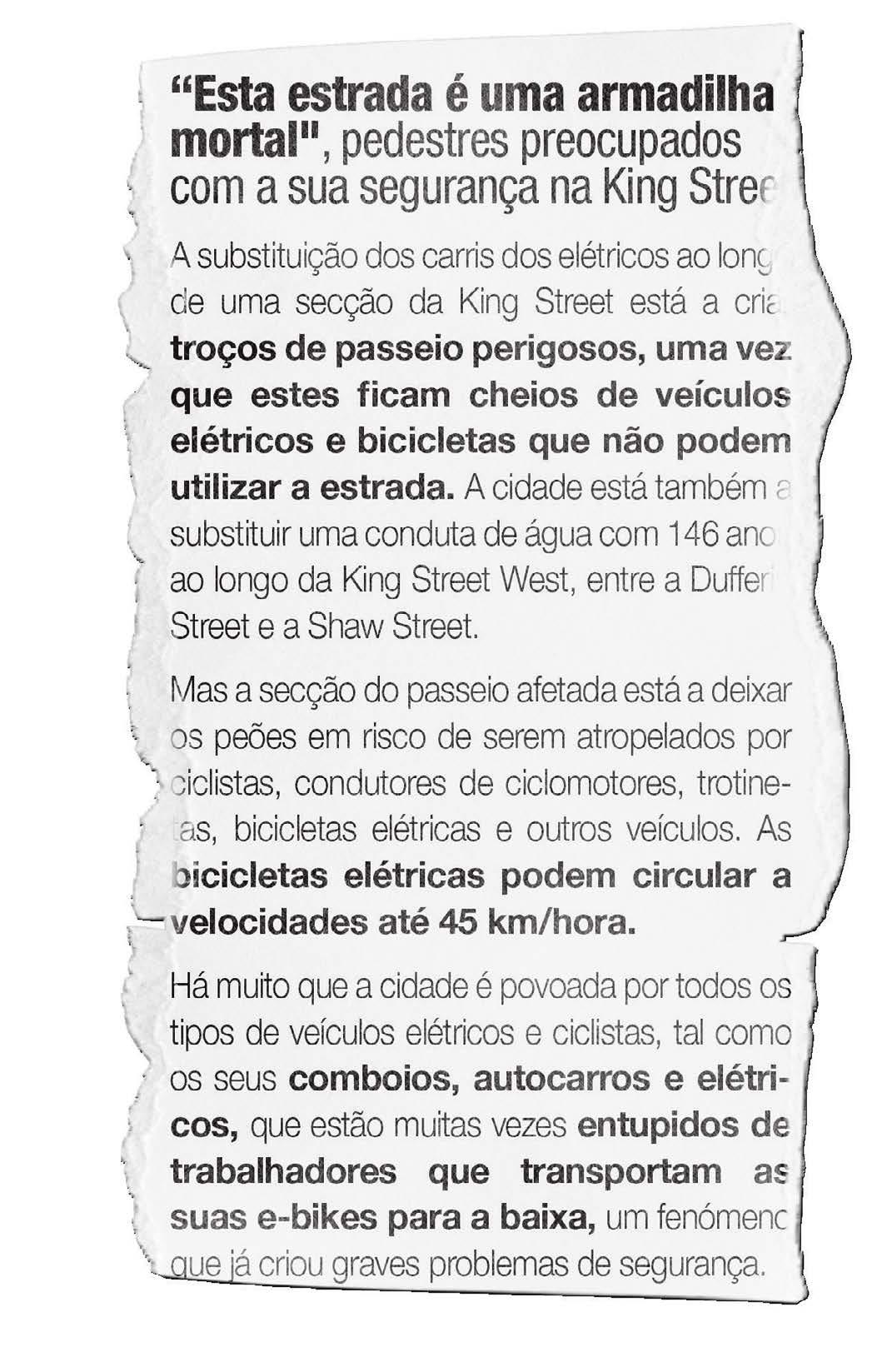 Resolvemos dedicar esta edição do Milénio a um tema que faz partes das conversas de todos nós, com demasiada regularidade e que se pode resumir a “Toronto já não é o que era”. E se a evolução natural das coisas tem esse dom de transformar, espera-se sempre que seja para melhor, mas... neste caso isso não está a acontecer. Antes pelo contrário, para o cidadão comum, o que anda em transportes públicos, inseguros e muito pouco coordenados com as necessidades do dia-a-dia de uma grande cidade, o que desespera dentro de um carro, que para andar 3/5 quilómetros demora mais de meia-hora, o que circula a pé numa cidade cheia de passeios com inúmeros obstáculos e até verdadeiras armadilhas em forma de desníveis ou buracos... en m, para nós os que não temos a obrigação de dizer o que é politicamente correto, Toronto está uma cidade caótica, tornando-se cada vez menos atrativa, para viver, trabalhar ou só passear.