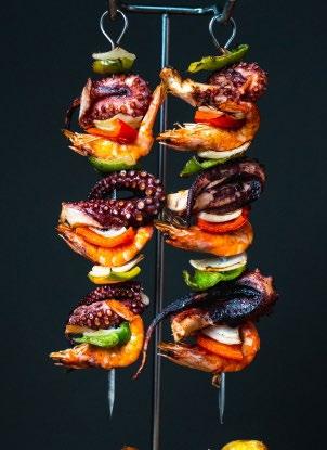 Preparar as espetadas com o polvo, as gambas e os pimentos. Grelhar durante 15 minutos, virar os espetos de vez em quando acompanhar com legumes.