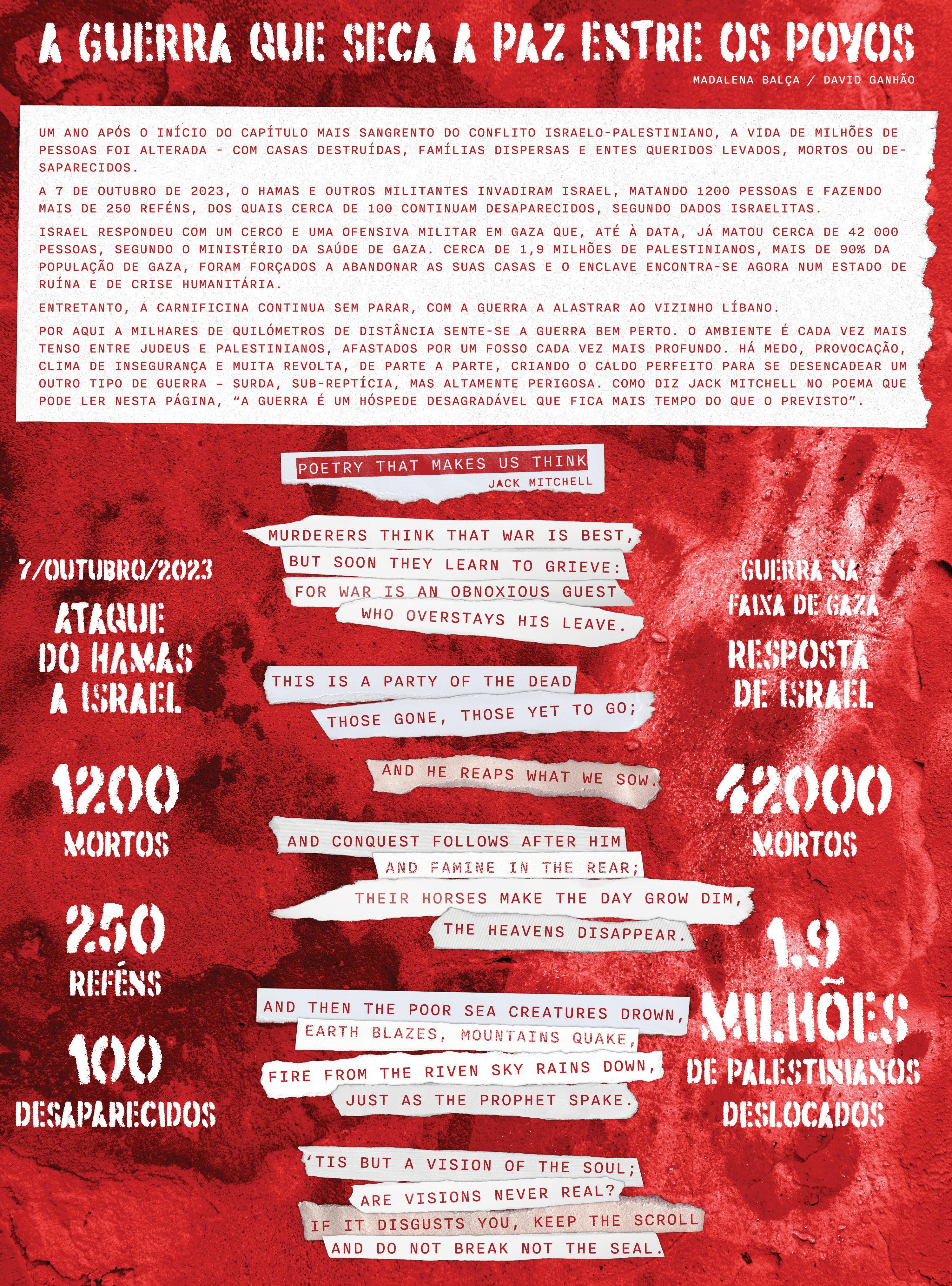 RS: Bem, essa é uma pergunta profunda. Uma pergunta difícil. Eu diria que agora que a guerra se expandiu para o Líbano e que o Irão se envolveu diretamente, o Iémen... só tem piorado. Os reféns ainda estão em Gaza. O governo israelita é conhecido por ser um dos governos israelitas mais à direita da história recente. Todas estas coisas não indicam que esta guerra esteja a chegar ao fim em breve. Parece que só está a aumentar. Infelizmente, não estou otimista quanto a uma paz tão cedo. A paz é alguma vez possível? Tenho sempre esperança. Tivemos um período, na década de 1890, em que os chamados Acordos de Oslo em que parecia que estávamos a aproximar-nos da paz. Por isso, só posso esperar que possamos tentar regressar a esse tipo de situação.
