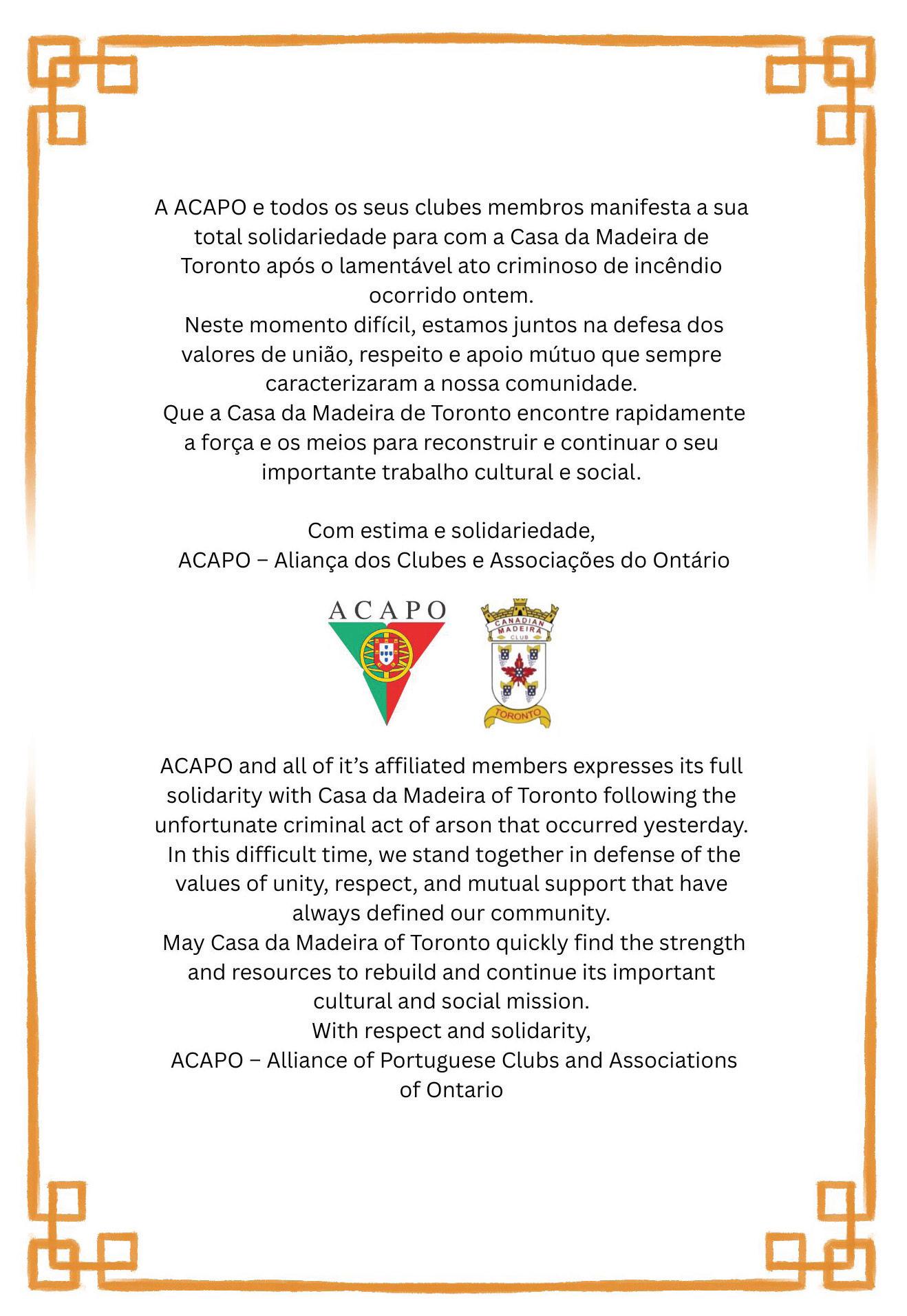 De acordo com a página o cial da ACAPO, a Aliança de Clubes e Associações tem atualmente 34 clubes e associações membros. Para além destes, há ainda que contar com o PCCM, clube não associado à ACAPO. Esta diversidade de instituições é, sem dúvida, sinal da vitalidade e da forte ligação dos luso-canadianos às suas raízes. No entanto, o que poderia ser um sintoma de riqueza e diversidade cultural tem vindo a revelar-se um problema crescente na comunidade: a sobreposição de eventos. Em determinadas alturas do ano, chegam a realizar-se oito ou dez eventos no mesmo dia e à mesma hora, muitos deles com ofertas semelhantes de comida, música e celebração regional. Nesta página, damos apenas o exemplo deste mês de outubro, mas se avançássemos para novembro, a situação seria igual ou pior. Esta realidade levanta uma questão inevitável: quem bene cia com esta desarticulação? Certamente não os clubes e associações, principalmente os de menor dimensão, que têm mais di culdade em garantir público su ciente para justi car os custos dos seus eventos. Nem a própria comunidade, que perde oportunidades de união e de partilha.