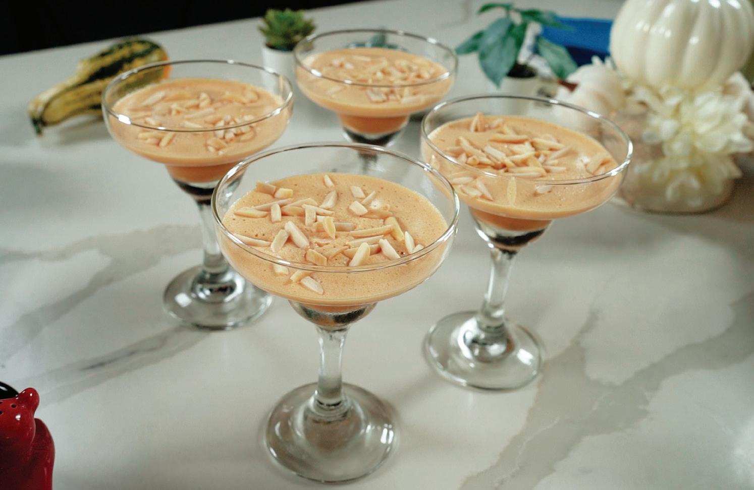 Colocar delicadamente em taças de vidro. Levar ao frigorífico durante 6 a 8 horas. Decorar com amêndoa palitada antes de servir. Até à próxima e bom apetite!