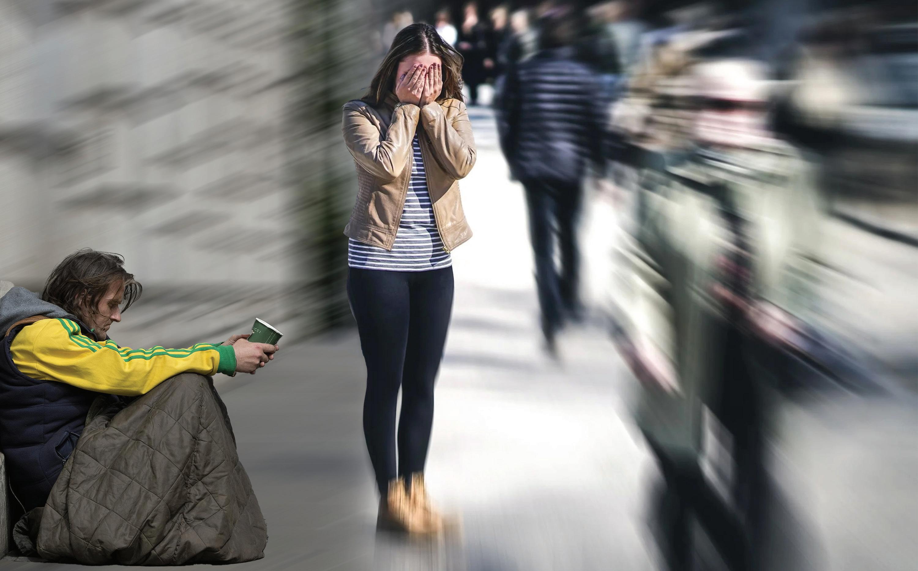 Está frio e não tenho onde dormir. Há algum lugar para onde me possa mandar?” Ele continua a andar, não olha para trás. Faz de conta que não a ouve.