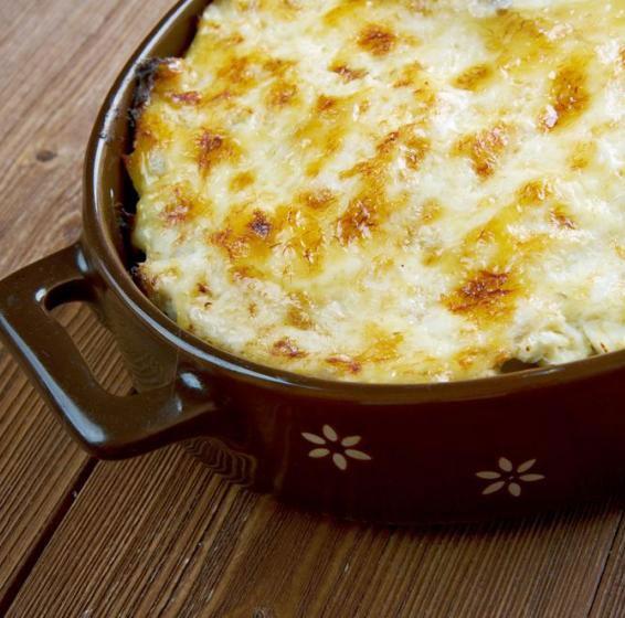 Cortar as cebolas em meias-luas finas e refogar em azeite, juntamente com alho picado, até ficarem translúcidas. Juntar as lascas de bacalhau, deixar refogar mais um pouco, misturar depois as batatas e envolver no preparado. Preparar um molho béchamel: derreter a manteiga num tacho, acrescentar a farinha e mexer bem. Juntar, aos poucos, 1 dl de água da cozedura do bacalhau, mexendo sempre. Juntar depois o leite e as natas e mexer até borbulhar. Finalmente, retirar do lume e temperar com sal, pimenta e noz moscada.