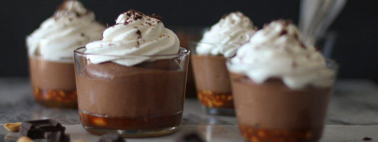 Partir o chocolate em pequenos pedaços. Juntar os pedaços com a manteiga num recipiente e levar ao microondas durante um minuto. Mexer até obter uma mistura cremosa. Bater as natas com o açúcar em pó até ficarem bem firmes e colocar no frigorífico. Num outro recipiente colocar as gemas e o açúcar, bater com umas varas até ficar uma mistura cremosa. Juntar a mistura anterior do chocolate e misturar bem, acrescentar as natas e envolver levemente com a espátula. Distribuir em taças individuais e levar ao frigorífico durante 6 horas. Decorar a gosto.