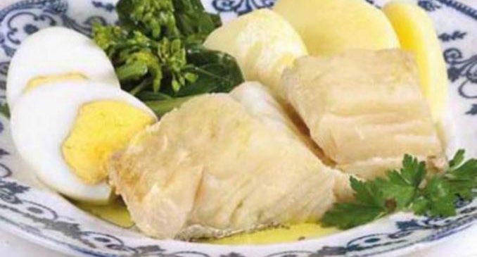 Cozer o bacalhau durante três minutos. Retirar a pele e as espinhas e desfazer em lascas pequenas. Reservar a água da cozedura. Descascar batatas, lavar, cortar em pequenos cubos e fritar em óleo quente, sem deixar alourar. Depois de fritas, escorrer bem e colocar sobre papel absorvente para tirar o excesso de gordura. Temperar com sal.