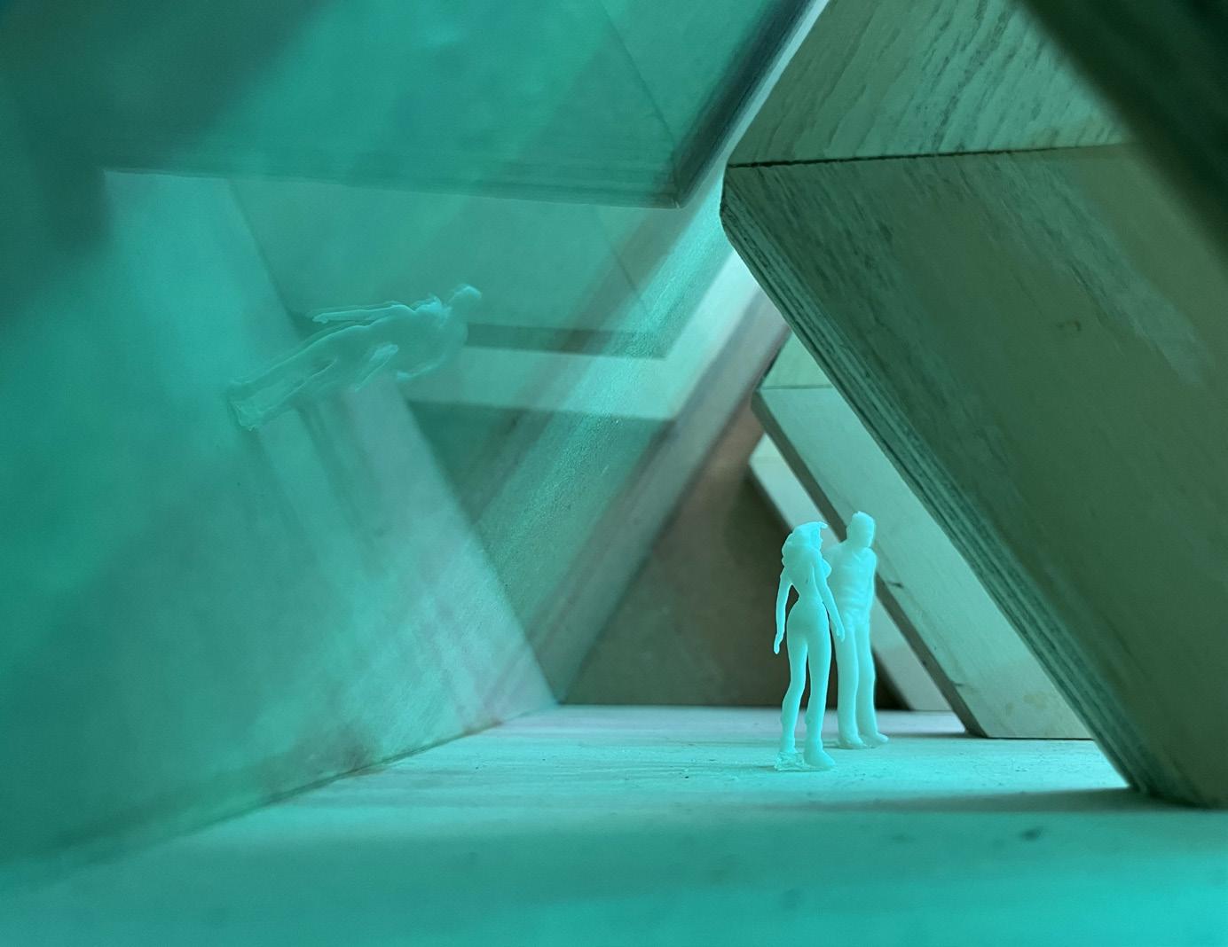 To differentiate from the standard method of thinking, when it comes to establishing a volume, this project removed the help of any and all digital aid. No 3D Modelling, photoshop, or postprocessing filters, instead the goal was to craft a small scale model that invites the sense of a much larger scale. I found that the use of texture played a huge role in establishing the atmosphere of a given space. To directly contrast with this, the use of mirrors disturbs what would be a confined place, and expands what could be expected around the next corner. To complete a scene, particular lighting conditions provide a continuity across multiple rooms, while eliminating any sense of familiarity in others. This project was extremely helpful in that it forces a unique paradigm in the way that you approach any given idea, therefore placing all the focus on the extent of your creativity.