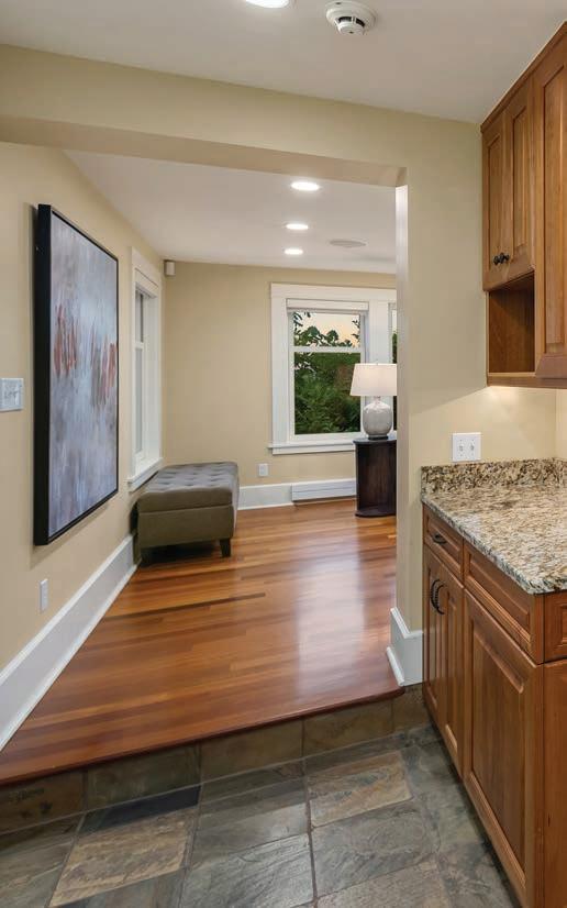 Wainscoted walls line the elegant staircase as it ascends to the upper level. The second floor living quarters have all-new hardwoods, a quiet sitting room, three bedrooms and one bathroom. Expansive windows in each room o er memorable views. The primary bedroom has a large walk-in closet. There is access to a private deck from two bedrooms. Completed architectural plans are available to convert and combine the master bedroom with the sitting room to create a grand primary suite.