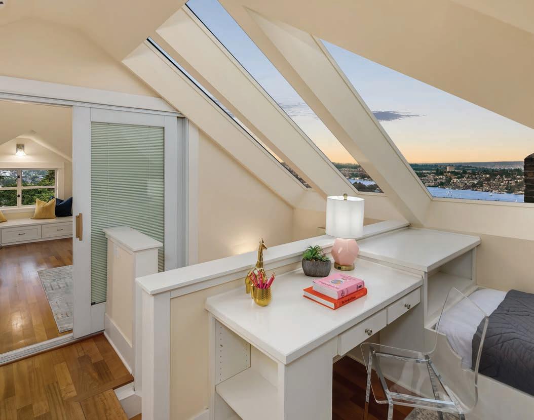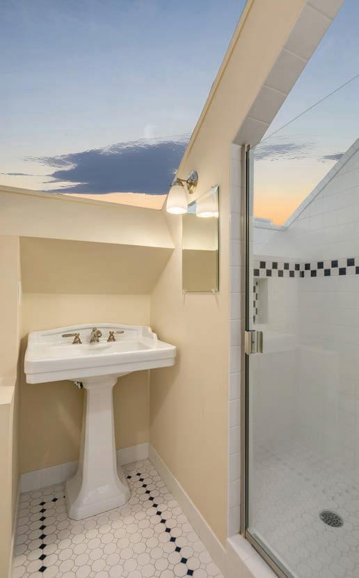 On the top floor you will find a spacious hideaway that really epitomizes the unique character of this home. Huge skylights illuminate the living space, which features one bedroom, a sitting room, bathroom with shower, cozy reading nooks, custom built-in beds and cabinets, large closets, and additional storage space. This level is perfect for the teens in your household or as a studio for the creative soul. This space retains the spirit of the home’s overall architectural style even though the renovation is more recent.