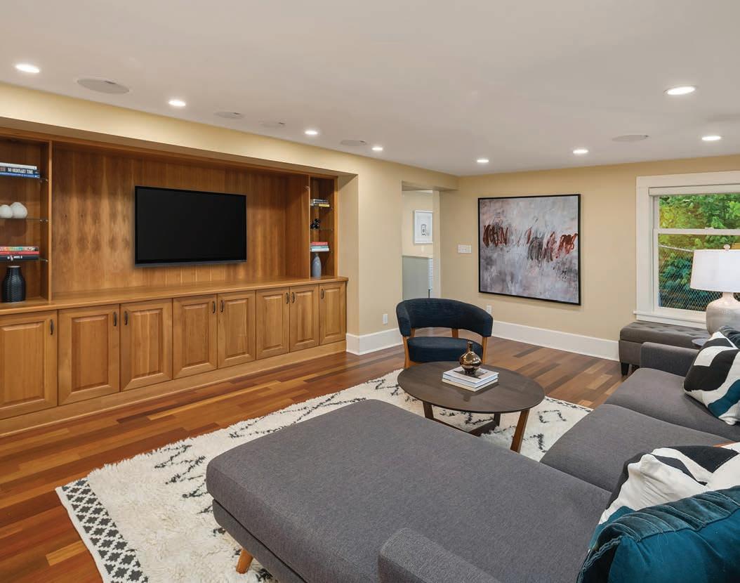 The lower level of the home provides plenty of space for any lifestyle and can function as separate living quarters. A small kitchen with wet bar features a built-in Sub-Zero refrigerator flanked by generous cabinet space. A sizable great room has a built-in media center and private deck access. There is also one bedroom, a full bathroom, laundry room, wine closet and a large number of closets and additional storage spaces. The secluded guest bedroom features California-style closet built-ins.