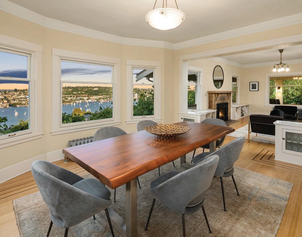 The large formal dining room has windows that project out to capture the iconic views of Lake Union, Lake Washington, Gas Works Park, and a sweeping panorama of the Cascades extending from Mt. Baker to Mt. Rainier.