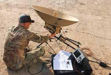 satellietschotels, oftewel ‘manpacks’. Anders dan oudere mobiele systemen zijn de manpacks zo compact dat zij op de rug gedra gen kunnen worden. Dankzij de satellietverbinding kunnen mili tairen in het veld contact houden met hun hoofdkwartier en andere eenheden.