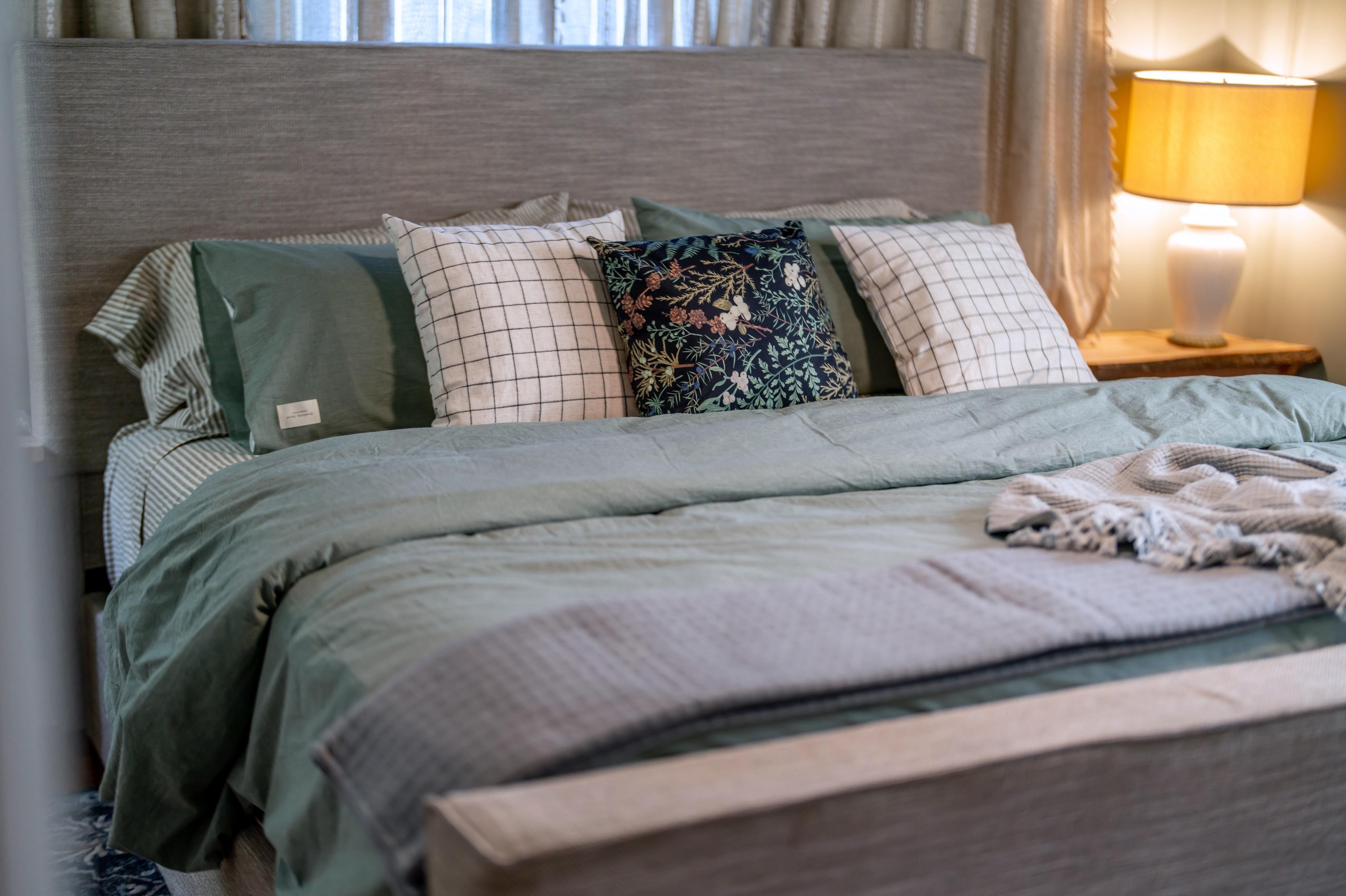 Walking into the Master Bedroom, Jennifer could immediately tell Sydney knew her style, and that she could level it up with design. Jennifer wanted to transform the room into a serene space for Sydney and Jared to enjoy after a long day. She incorporated custom-made elements, such as handmade wooden side tables meticulously crafted by a carpenter affiliated with Purple Heart Homes, that she knew the Bowmans would absolutely fall in love with.