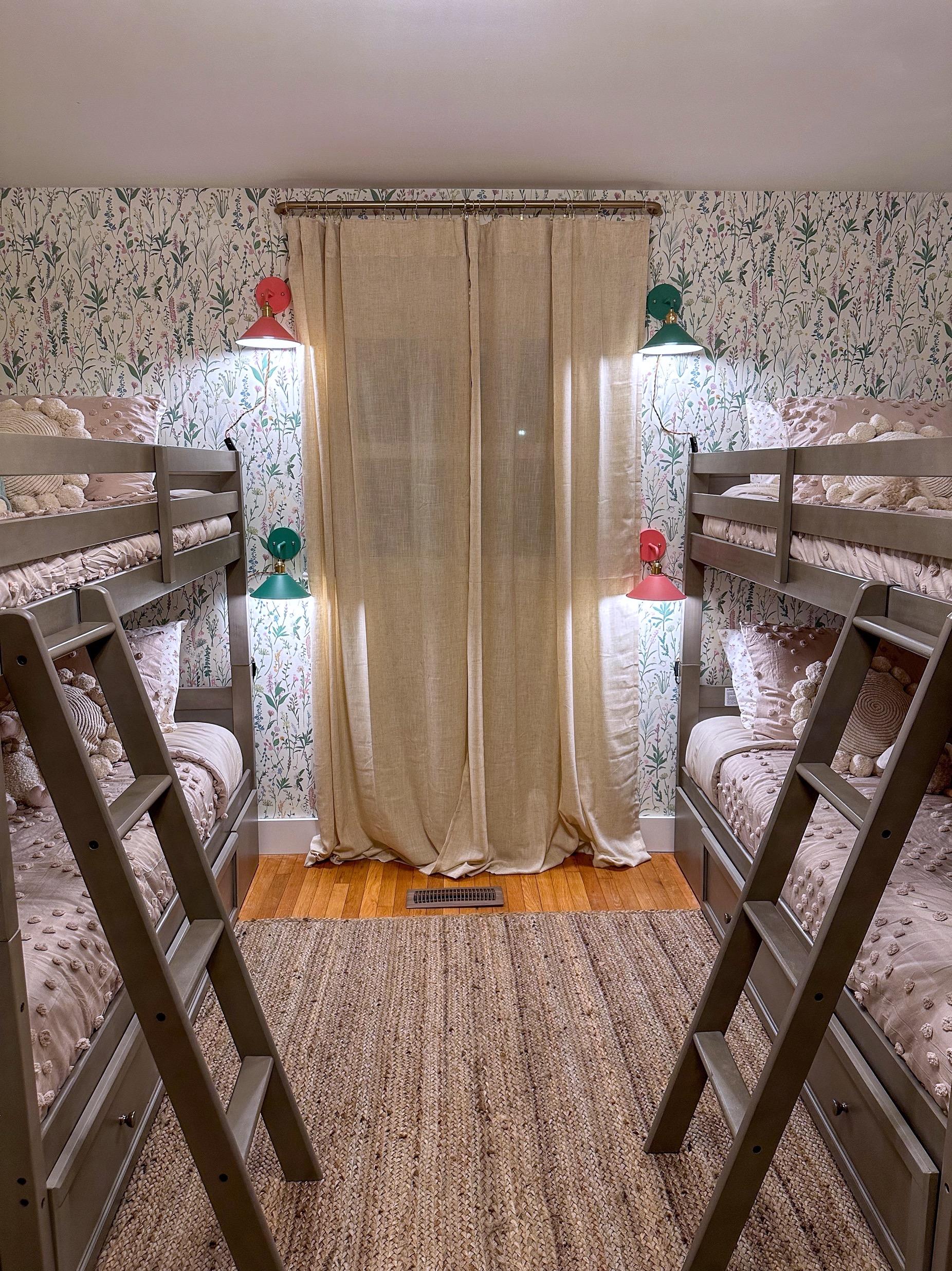 Jennifer Bertrand works her design magic in the girls’ bedroom, transforming it into the perfect spot for four girls. She wanted to include a lot of personal, vintage artwork to give the girls a space where they could fully let loose and let their creativity thrive.