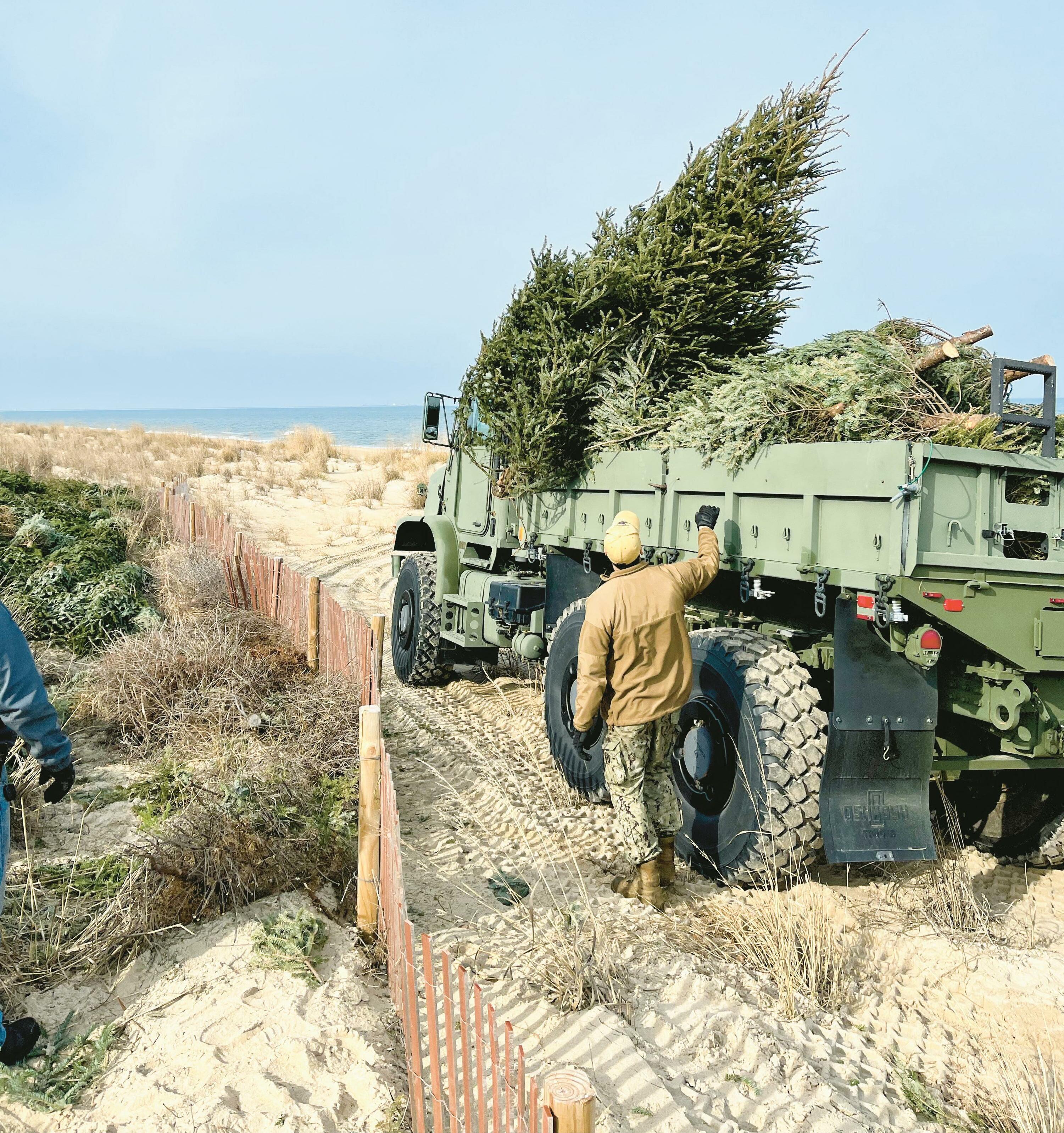 ABOVE: Volunteers from base units helped haul 1,174 trees that were placed along theJoint Expeditionary Base Little Creek-Fort Story shoreline to enhance beach dunes. BELOW: Carpenter’s Mate 3rd Class Trenton Ferguson, assigned to Explosive Ordnance Disposal Expeditionary Support Unit Two, hauls trees during the 2023 Annual Christmas tree Recycling eventJan. 11.