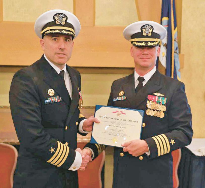 Pittman, commodore,Submarine Squadron Six,right, presents the Legion of Merit award to Capt. Bennett Christman, left during a change of command ceremony fortheVirginia-class fast-attacksubmarine USS NewHampshire (SSN 778) onboard Naval SupportActivity Hampton Roads,Jan.20