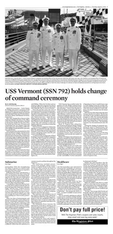 of Squadron 4, I knew I could always count on Cmdr. Phillips to keep his warship welltrained, professional and mission ready. And I have the utmost confident in Cmdr. Lilleberg as he leads Vermont into the future from here.” SSN 792 is U.S. Navy ship to bear the name Vermont, but first in a century. The first was one of nine 74-gun warships authorized by Congress in 1816. The second, Battleship No. 20, was commissioned in 1907 and first deployed in December of that year as part of the “Great White Fleet.” The battleship Vermont was decommissioned June 30, 1920. During the change of command ceremony, the sword of Revolutionary War hero Ethan Allen, one of Vermont’s founders, was granted for exhibition by the Naval History and Heritage Command. The submarine Vermont is 377 feet long and has a 34-foot beam, as well as a crew of more than 130 Navy personnel. Fast-attack submarines are multi-mission platforms enabling five of the six Navy maritime strategy core capabilities — sea control, power projection, forward presence, maritime security and deterrence. They are designed to excel in anti-submarine warfare, anti-ship warfare, strike warfare, special operations, intelligence, surveillance and reconnaissance, irregular warfare and mine warfare. Fast-attack submarines project power ashore with special operations forces and Tomahawk cruise missiles in the prevention or preparation of regional crises.