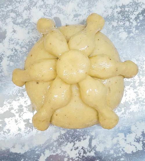 If you roll the small portions into a rope, keeping your fingers roughly in the same place, you will create 4 little nobbies on the rope When arranged on the bread, these look remarkably like a pile of bones. Itismostcommontoarrangethebonesina circlepattern,representingthecircleoflife.