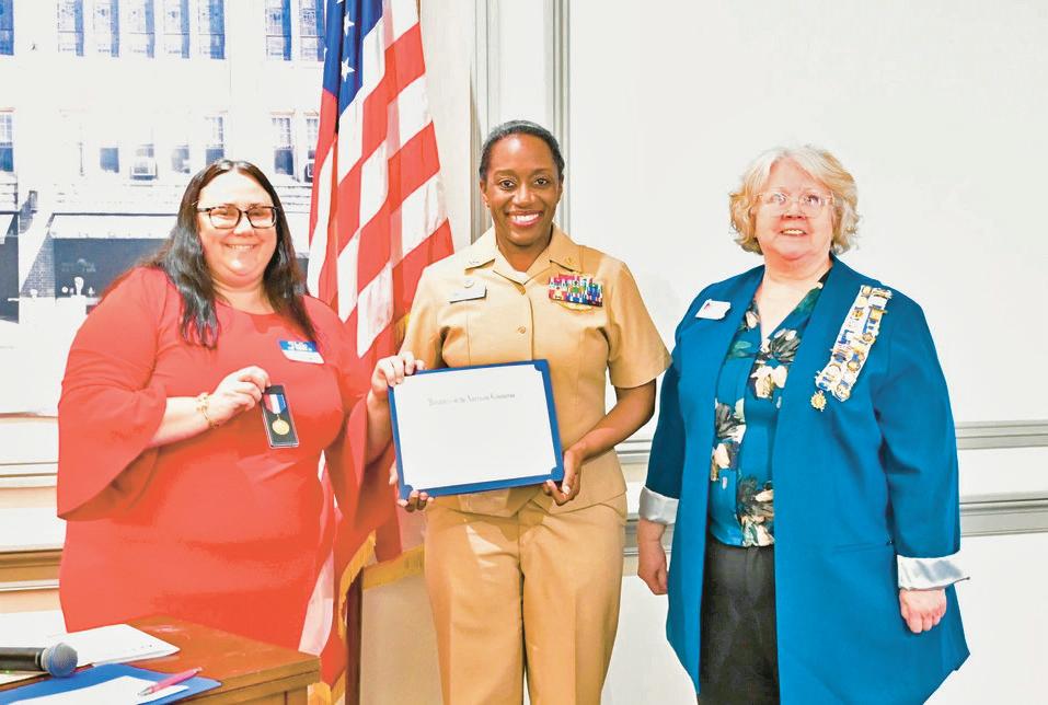 Coanne O’Hern, chapter regent, and Laura McCabe, chapter National Defense Committee chair, presented Thomas with a certificate and medal while introducing her to the group Captain Thomas is the first woman to serve as the commanding officer of NSA Mechanicsburg in its more than 80-year history and the DAR chapter wantedtorecognizeherforit