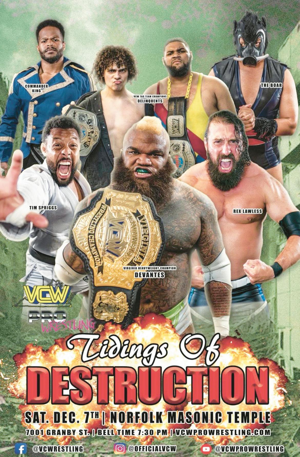 adarkhorseinanunpredictablematchlike the Derby. King Malone and LDJ have all shown promise in their performances in VCW, and A VCW Liberty Championship victory would launch any of them into a new level of superstardom. The challengerscannotoverlookEsparza,however,who notably captured his championship in a multi-manmatchearlierthisyear Tickets for VCW’s final show of the year are available at vcwprowrestling.com and at the door on Saturday, December 7. The Norfolk Masonic Temple is located at 7001 GranbySt,Norfolk,VA23505 Doorsopenat 6:30p.m.withbelltimeat7:30p.m. Tidings of Destruction from Page 1