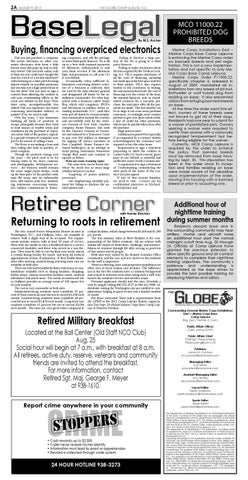 Commanding General, Marine Corps Installations East — Marine Corps Base Camp Lejeune Brig. Gen. Thomas A. Gorry Public Affairs Officer Capt. Joshua Smith Public Affairs Chief Staff Sgt. Theresa Seng theresa.seng@usmc.mil Publisher James M. Connors jim.connors@pilotonline.com Managing Editor Ena Sellers ena.sellers@pilotonline.com Assistant Managing Editor Amy Binkley amy.binkley@pilotonline.com Layout Editor Sarah Anderson sarah.anderson@militarynews.com Sports Editor Jessie Heath jessie.heath@pilotonline.com This Department of Defense newspaper is an authorized publication of the DOD. Contents of The Globe are not necessarily the official views of, or endorsed by, the U.S. government, the DOD, or the Public Affairs Office, Camp Lejeune, N.C. The Globe is published by Landmark Military Newspapers of N.C., a private enterprise not connected with the DOD or the U.S. Marine Corps, under exclusive written contract with Marine Corps Base Camp Lejeune, N.C. The appearance of advertising in this publication, including inserts or supplements, does not constitute endorsement of these products or services by the DOD, the U.S. Marine Corps, or Landmark Military Newspapers of N.C. Everything advertised in this publication shall be made available for purchase, use or patronage without regard to race, color, religion, sex, national origin, age, marital status, physical handicap, political affiliation, or any other nonmerit factor of the purchaser, user, or patron. If a violation or rejection of this equal opportunity policy by an advertiser is confirmed, the publisher shall refuse to print advertising from that source until the violation is corrected. The editorial content of this publication is the responsibility of the Public Affairs Office, Camp Lejeune, N.C. Any questions may be directed to: Commanding General, (Attn: Public Affairs Office), Marine Corps Base, PSC Box 20004, Camp Lejeune, N.C. 28542-0004. For distribution and advertising inquiries, call 3479624. Mail subscribers: Any notices to report a change of address need to be sent to: Landmark Military Newspapers - NC, 1122 Henderson Dr., Jacksonville, N.C. 28540. For advertising questions or to submit free trader ads, call 347-9624, ext. 101.
