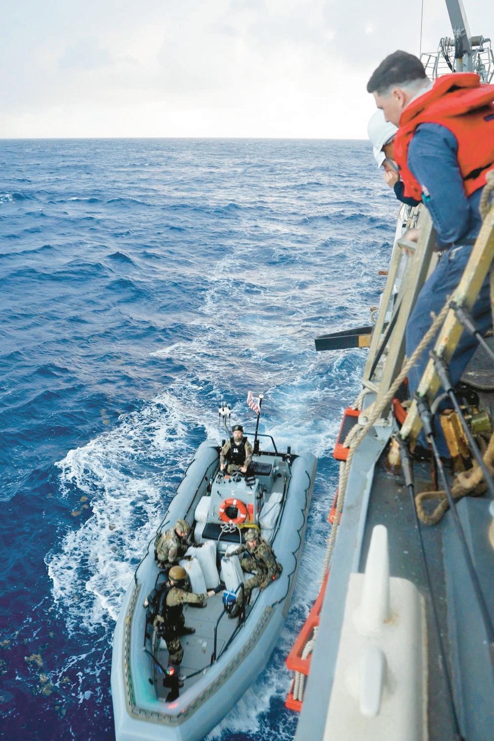 Coast Guardsmen assigned to U.S. Coast Guard Law Enforcement Detachment (LEDET) 401, embarked on the Arleigh Burke-class guided-missile destroyer USS Gravely (DDG 107), board the ship’s ridged hull inflatable boat to conduct maritime interdictionoperations(MIO),whileunderwayintheCaribbeanSea.