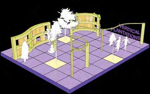 (above) Illustration of the vertical plantations hub. (above) Illustration of the gardening hub.
