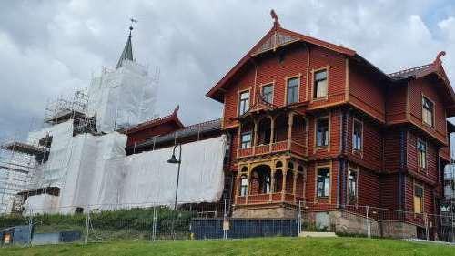 Det ikoniske dragebygget ved Scandic Holmenkollen Park er nå ferdig rehabilitert etter ett år bak stillas og plast. Nå fremstår det i sin opprinnelige prakt mørkt brunt med dekor i tilnærmet ultramarin farge De gamle tømmerveggene er malt med linoljemaling og er sikret for mange år fremover.