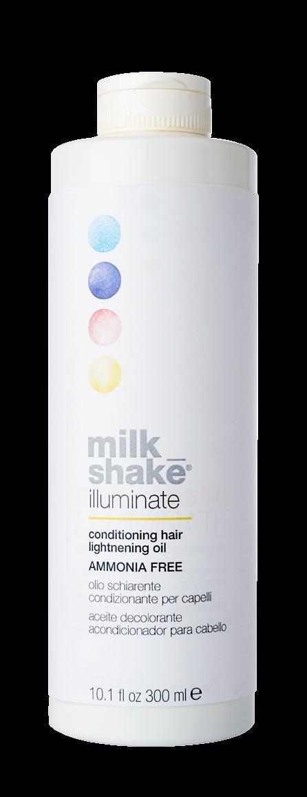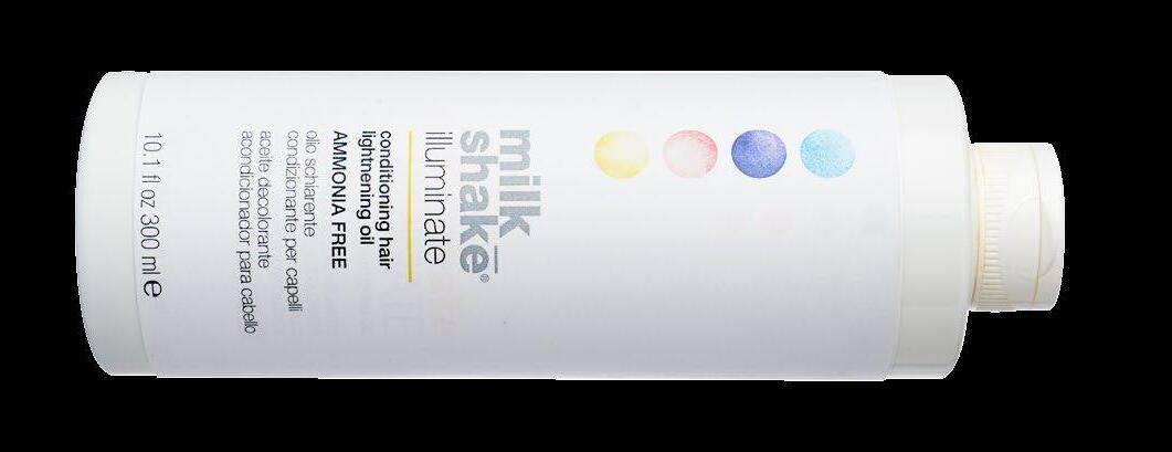 milk_shake® illuminate conditioning lightening oil is a lightening, conditioning oil that acts gently on the hair, with a formula that is ammonia-free and contains certified organic oils. Lightens hair up to 3-4 levels according to the combined oxidiser.