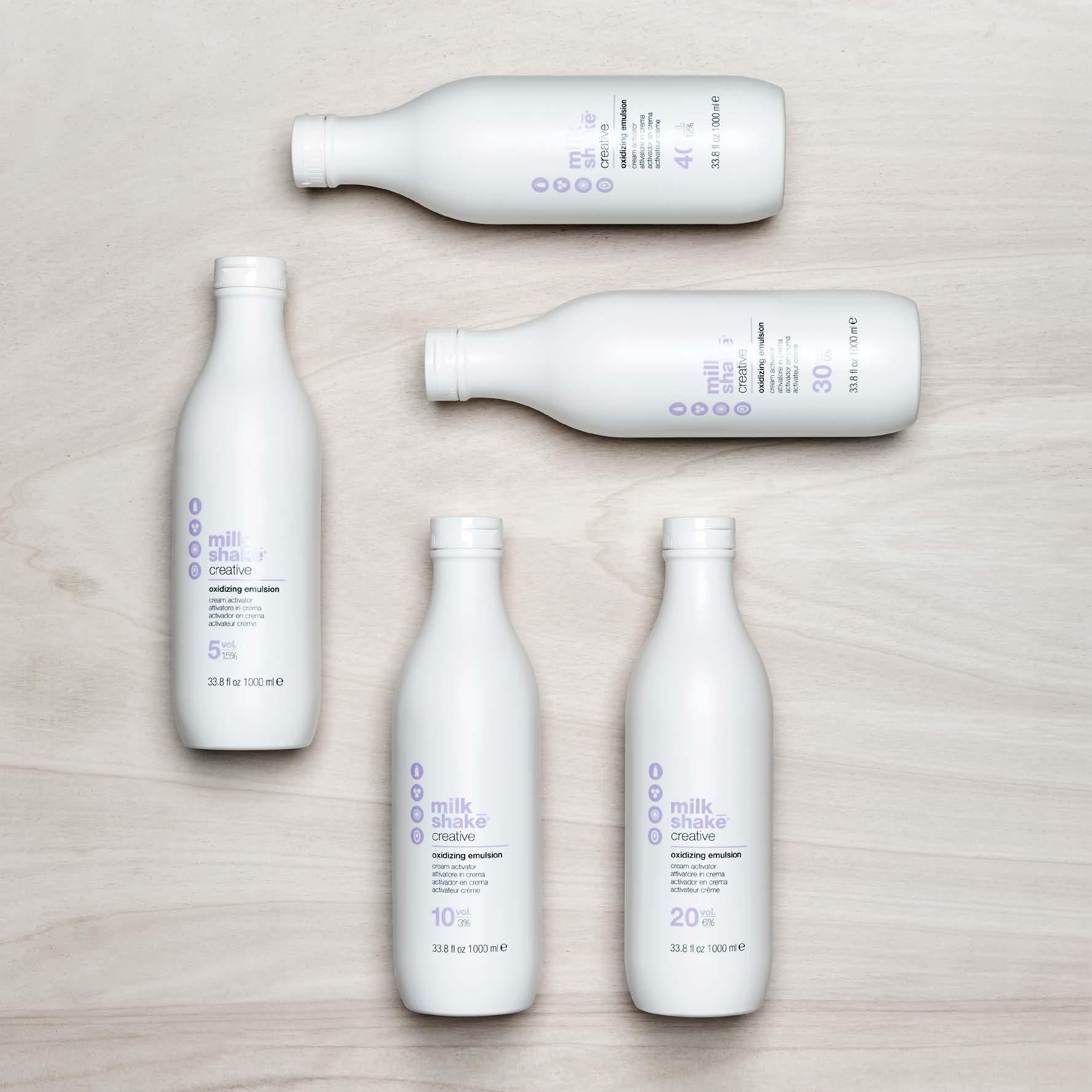5 developers specifically formulated to act in synergy with milk_shake® formulas, in 5 different strengths: 5 / 10 / 20 / 30 / 40 volumes