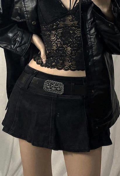 O vestido preto com luvas longas exala mistério e sofisticação, enquanto a combinação das meias rendadas vermelhas com a saia de couro e botas adiciona um toque ousado e moderno. Charmoso e cheio de atitude!