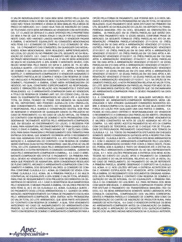 O VALOR INDIVIDUALIZADO DE CADA BEM SERÁ OBTIDO PELA QUANTIA MÉDIA APURADA COM A VENDA DE BENS EQUIVALENTES NO LEILÃO, OU, CASO NÃO TENHA OCORRIDO A VENDA DE BEM SIMILAR, PELA MÉDIA DE PREÇO DO MERCADO. 3.6.1. CASO HAJA TAXA DE INSCRIÇÃO DO CANAL DE TELEVISÃO, ESTÁ SERÁ INFORMADA AO VENDEDOR COM ANTECEDÊNCIA. 3.7. O LANCE DE DEFESA É O LANCE OFERTADO PELO PROPRIETÁRIO DO BEM A FIM DE QUE A VENDA ATINJA O VALOR POR ELE ESPERADO. NESTE CASO, NÃO HAVENDO LANCES MAIORES, O VENDEDOR PAGARÁ À EMBRAL O MONTANTE EQUIVALENTE ÀS COMISSÕES MENCIONADAS NOS ITENS 3.5.1 (COMISSÃO DE COMPRA) E 3.5.2 (COMISSÃO DE VENDA). 3.8. O PAGAMENTO DAS COMISSÕES, EM QUAISQUER DAS MODALIDADES ACIMA MENCIONADAS, SERÁ REALIZADO, IMPRETERIVELMENTE, NO LOCAL DO LEILÃO OU NO PRIMEIRO DIA ÚTIL SEGUINTE AO DA REALIZAÇÃO DO EVENTO. 3.8.1. CASO O PAGAMENTO NÃO SEJA REALIZADO NO PRAZO MENCIONADO NA CLÁUSULA 3.8, O VALOR SERÁ ACRESCIDO DE MULTA NO EQUIVALENTE A 20% SOBRE O MONTANTE DEVIDO, CORREÇÃO MONETÁRIA PELO ÍNDICE DO IGP-M E JUROS DE 1% AO MÊS. CLAÚSULA QUARTA – DO CONTRATO DE VENDA E COMPRA, DA RESERVA DE DOMÍNIO E DA GARANTIA DO CONTRATO 4.1. APÓS A “BATIDA DO MARTELO”, O ARREMATANTE-COMPRADOR E O VENDEDOR ASSINARÃO O “CONTRATO PARTICULAR DE COMPRA E VENDA COM RESERVA DE DOMÍNIO VINCULADO À PROMISSÓRIA RURAL” (“CONTRATO COM RESERVA DE DOMÍNIO”), FIGURANDO A EMBRAL COMO MERA INTERMEDIADORA DO NEGÓCIO, NO QUAL CONSTARÃO ESPECIFICAMENTE AS RESPONSABILIDADES E OBRIGAÇÕES EM RELAÇÃO AOS PAGAMENTOS E EVENTUAIS PENALIDADES. 4.2. O ARREMATANTE-COMPRADOR DARÁ AO VENDEDOR, A TÍTULO DE RESERVA DE DOMÍNIO (ART. 521, DO CÓDIGO CIVIL), OS ANIMAIS OU EQUIPAMENTOS ARREMATADOS NO LEILÃO ATÉ A QUITAÇÃO TOTAL DA DÍVIDA, FICANDO DE POSSE DOS MESMOS NA QUALIDADE DE FIEL DEPOSITÁRIO, NÃO PODENDO ALIENÁ-LOS E/OU ONERÁ-LOS, SEM CONSENTIMENTO, POR ESCRITO, DO VENDEDOR, ALÉM DE SER O RESPONSÁVEL PELA GUARDA E CONSERVAÇÃO DESTES, SOB PENA DE INDENIZAR O VENDEDOR DE QUAISQUER DANOS OU PREJUÍZOS NO CASO DE PERECIMENTO. 4.3. NO CASO DE LEILÃO VIRTUAL, OS TERMOS DO CONTRATO COM RESERVA DE DOMÍNIO E NOTA PROMISSÓRIA CONSIDERAM-SE TACITAMENTE ACEITOS PELO ARREMATANTE-COMPRADOR, QUE, EM SEGUIDA AO ENCERRAMENTO DO LEILÃO, O RECEBERÁ POR E-MAIL PARA ASSINATURA, RECONHECIMENTO DE FIRMA QUANDO SOLICITADO, E ENVIO À EMBRAL, NO PRAZO MÁXIMO DE 7 (SETE) DIAS CORRIDOS, PARA BAIXA FINANCEIRA E PROSSEGUIMENTO DOS TRÂMITES PARA ENTREGA DOS BENS, QUE SOMENTE OCORRERÁ APÓS O RECEBIMENTO DAS VIAS ASSINADAS DOS DOCUMENTOS. 4.4. ATO CONTÍNUO À ARREMATAÇÃO E À ASSINATURA DO CONTRATO COM RESERVA DE DOMÍNIO SERÃO EMITIDAS DUAS NOTAS PROMISSÓRIAS: UMA RELATIVA AO VALOR TOTAL DO LOTE (GARANTIA DADA PELO ARREMATANTE-COMPRADOR AO VENDEDOR) E A OUTRA REFERENTE À COMISSÃO DA EMBRAL (GARANTIA DADA PELO ARREMATANTE-COMPRADOR À EMBRAL). 4.5. CASO O ARREMATANTE-COMPRADOR NÃO EFETUE O PAGAMENTO DA PRIMEIRA PARCELA, DEVIDO AO VENDEDOR, O CONTRATO COM RESERVA DE DOMÍNIO, AINDA QUE PENDENTE DE ASSINATURA, SERÁ CONSIDERADO RESOLVIDO DE PLENO DIREITO, ARCANDO O ARREMATANTE-COMPRADOR COM O PAGAMENTO À EMBRAL DOS SEGUINTES VALORES: (I) COMISSÃO DE COMPRA: CONFORME CLÁUSULA 3.5.1, ACIMA; (II) COMISSÃO DE VENDA: CONFORME CLÁUSULA 3.5.2, ACIMA; (III) A PRIMEIRA PARCELA E (IV) MULTA CONTRATUAL NO EQUIVALENTE A 20% SOBRE O VALOR TOTAL APURADO, PARA FINS DE RESSARCIMENTO DOS PREJUÍZOS DECORRENTES DA DESISTÊNCIA DO NEGÓCIO. 4.5.1. CASO A DESISTÊNCIA SEJA MANIFESTADA PELO VENDEDOR, O MESMO PAGARÁ À EMBRAL OS VALORES PREVISTOS NOS ITENS (I), (II) E (IV) DA CLÁUSULA 4.5, ACIMA. CLÁUSULA QUINTA – DO PAGAMENTO DO(S) LOTE(S) ARREMATADO(S) 5.1. QUANDO DA ARREMATAÇÃO, INDEPENDENTEMENTE DA FORMA DE PAGAMENTO ESCOLHIDA PELO ARREMATANTE-COMPRADOR, SERÁ EMITIDA NOTA PROMISSÓRIA DO VALOR TOTAL DO LOTE ARREMATADO, QUE SERÁ PARTE INTEGRANTE DO “CONTRATO COM RESERVA DE DOMÍNIO”, A QUAL TERÁ VENCIMENTO ANTECIPADO NO CASO DE INADIMPLEMENTO DO ARREMATANTE-COMPRADOR. 5.2. NO ATO DA ARREMATAÇÃO, QUANDO DA EMISSÃO DO CONTRATO COM RESERVA DE DOMÍNIO O ARREMATANTE-COMPRADOR FARÁ A