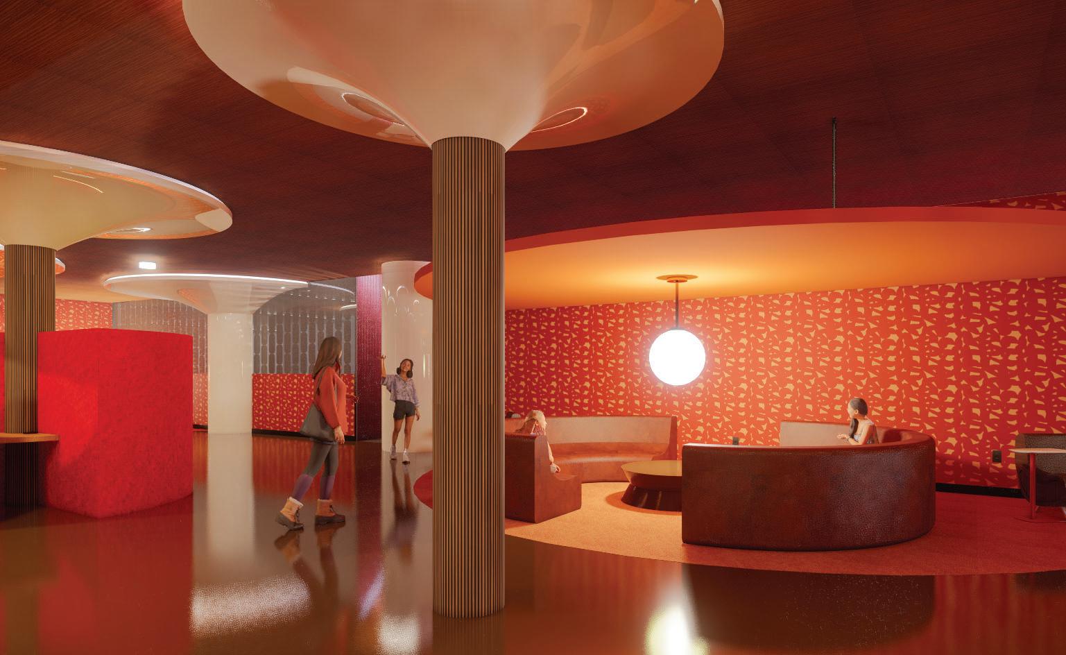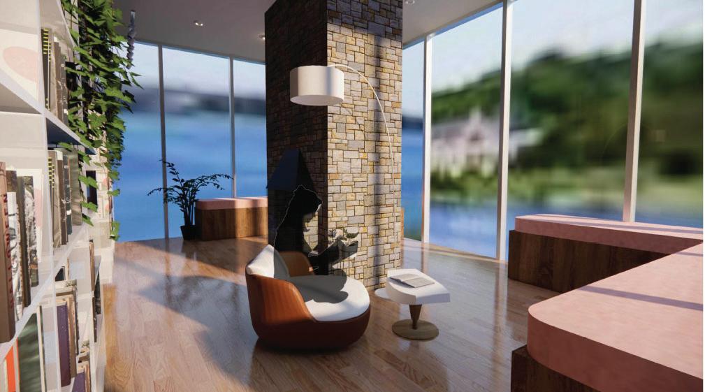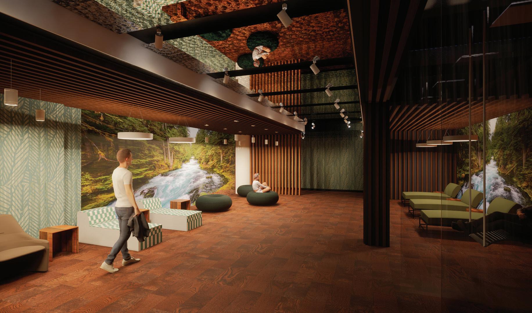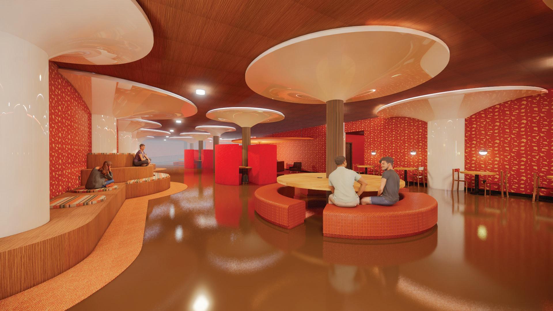 The interior restoration project for the student lounge (The Cove)will create an inviting and inspiring oasis amidst the rigors of college life. Balancing the demands of a contemporary campus common area with the desire for a cozy, earthy ambiance, the space will incorporate subtle elements of nature, including modern canopies, natural, warm materials and colors, scenic imagery and sunlight. Various speciality spaces will provide levels of seating and lighting options for diverse needs.