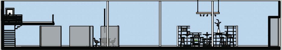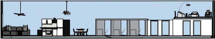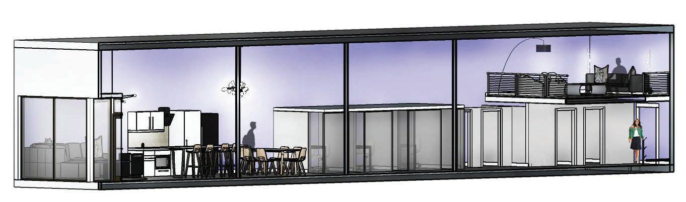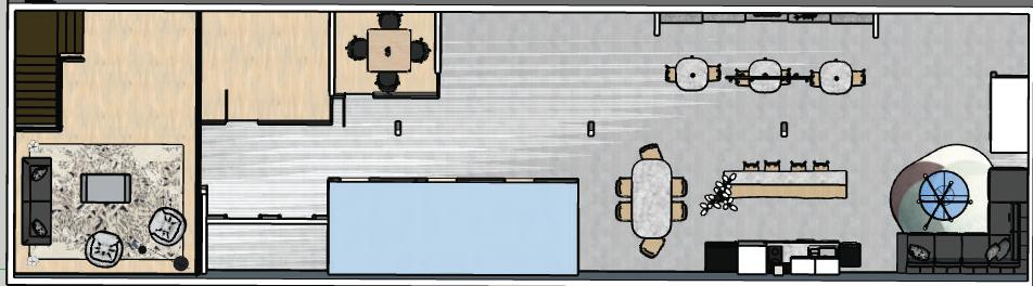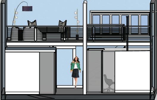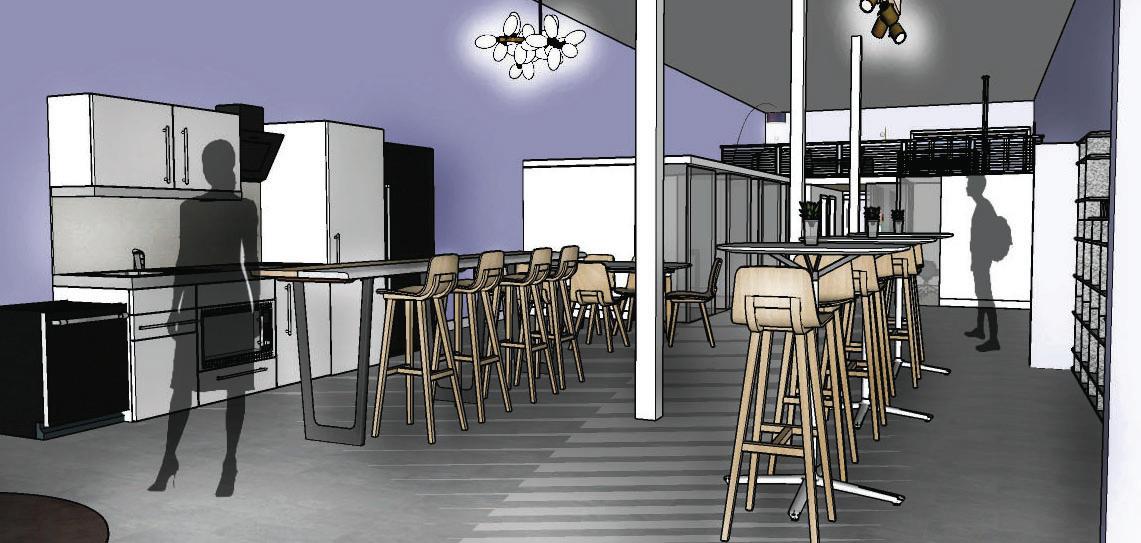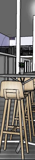 Select furniture, fixtures and equipment for a public co-working space in Ames, Iowa. Develop structure, apply materials, and select views in SketchUp.