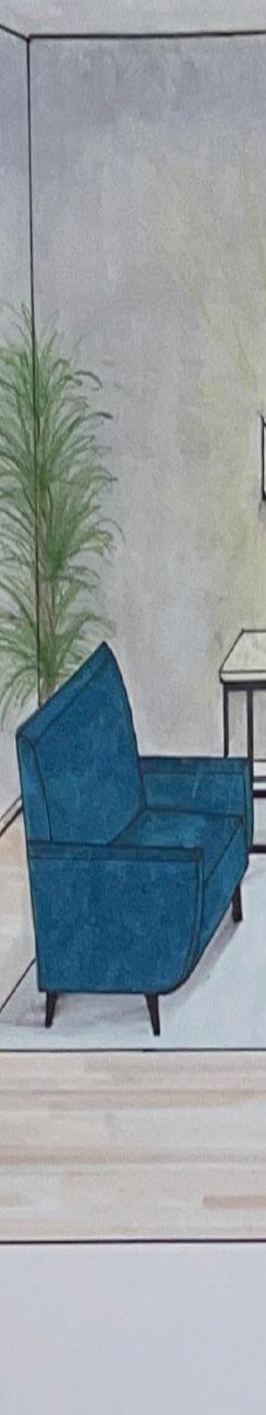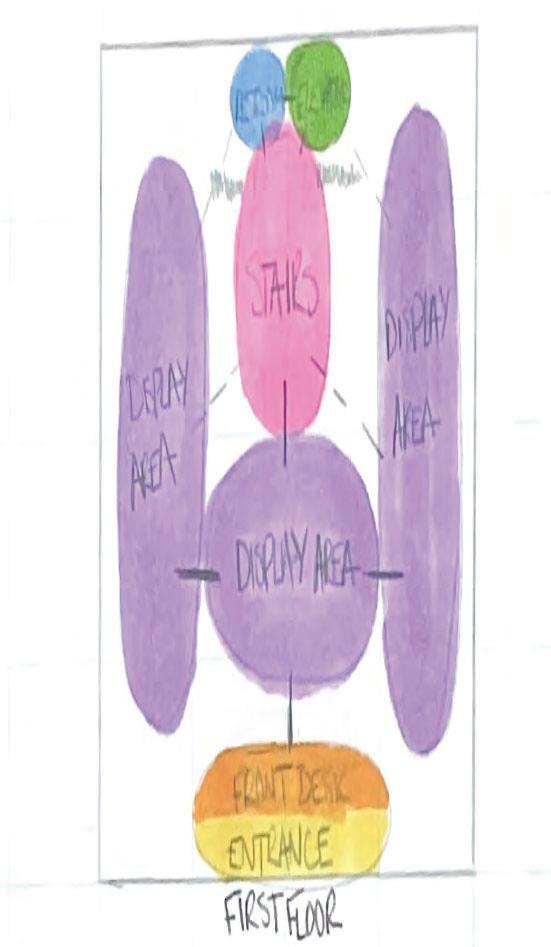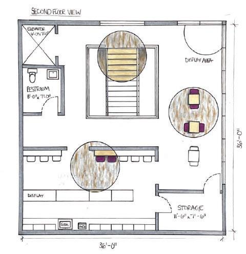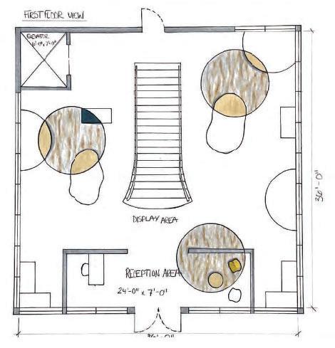 This design is intended to provide a spacious, organic, and awe-inspired gallery atmosphere. Overarching use of continuity among furniture, finishes and natural elements allows each space within the design to flow seamlessly into the next, producing an intriguing, efficient environment for visitors to navigate and admire. Strong, interconnected use of volume and scale is meant to evoke a sense of wonder, with emphasis on displayed artwork, as well as human connection within the space.