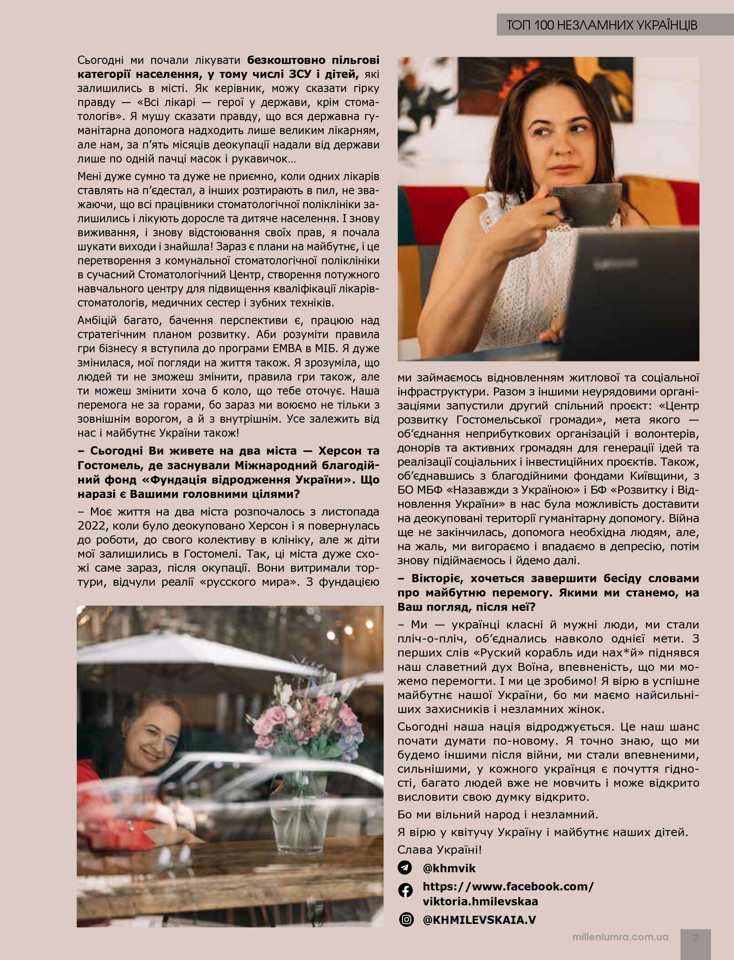Я, до речі, достатньо давно відчула у собі силу родинної міці. І зараз, коли цікавлюсь історією родини, розумію, що ми дійсно завжди були незламними. Наша незламність, якщо хочете, це прагнення до свободи, до волі будувати свою долю самостійно. Ми не можемо не боротись. Навіть у власній реалізації. Я, наприклад, у бізнесі понад тридцять років, пережила багато чого у професійній сфері та не підкорилась умовам. На сьогодні ми маємо цікаву, гарну справу, продовжуємо боротись за прозорість ведення бізнесу, змінюючи систему. Це про свідомість, про боротьбу та життя.