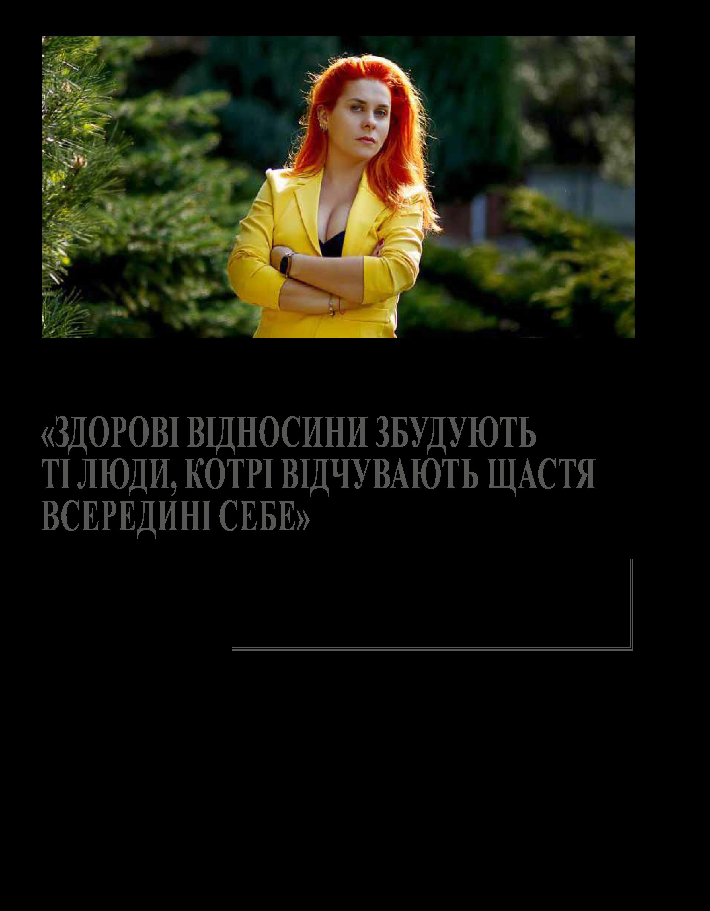 - Шлях до справи всього мого життя був вельми цікавий. У цю професію я прийшла вже після 35 років. Тоді в один момент звільнилася з колишньої роботи й вступила до університету на факультет психології. Я була рада, що моя сім’я мене підтримала в цьому рішенні. Сказати, що люблю свою роботу, це не сказати нічого. Для мене велике щастя допомагати людям. Ось кажу Вам, і мурашки пробігли по тілу. Для мене кожна людина – це Всесвіт. Я нікого ніколи не оцінюю і не засуджую, немає абсолютно поганої або абсолютно гарної душі, і порівнювати себе або когось із кимось, шлях в нікуди. І як сказав наш друг Зигмунд Фрейд: «Єдина людина, з якою ви маєте порівнювати себе, – це ви в минулому. І єдина людина, кращою за яку ви маєте бути, – це та, хто ви є зараз...».