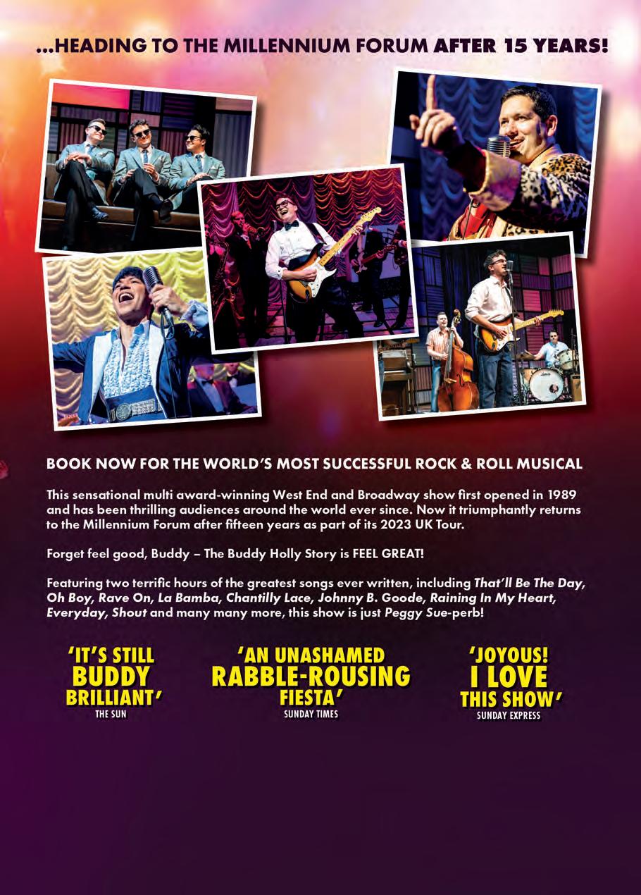 ACCESS FOR ALL MEMBERSHIP SCHEME. Our Access for All Scheme has been designed for people with physical/sensory or cognitive disabilities, and is a practical display of the Millennium Forum’s belief that there should be equal access to our theatre for everyone. For an application form and more information regarding this scheme contact lisah@ millenniumforum.co.uk. Information can also be downloaded from millenniumforum. co.uk under “access”.