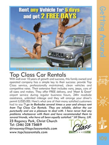 Top Class Car Rentals With well over 10 years of growth and success, this family owned and operated company has a simple key to their success: provide Top Class service, professionally maintained, clean vehicles and competitive rates. Their extensive fleet includes vans, jeeps, cars of all sizes and mokes. They offer FREE delivery, and ‘Meet & Greet’ airport service during regular business hours, 24hr roadside assistance, unlimited mileage and they will arrange your driver’s permit (US$5.00). Here’s what one of their many satisfied customers had to say:“I go to Barbados several times a year and always rent from Top Class Car Rentals. They are reliable, deliver the car punctually and are a pleasure to deal with. I have never had any problems whatsoever with them and have recommended them to several friends, who have all been equally satisfied.” Jill Sherry, UK.