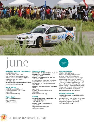 Crop Over Festival is Barbados’ premier cultural festival and is celebrated island-wide over an eight week period from June to August each year. Events taking place during June include: Heritage Bus Tour; City Fest & Ceremonial Delivery of the Last Canes; Junior Calypso Monarch Tents; Visual Arts Festival. Call the National Cultural Foundation at 417-6610. barbadoscropoverfestival.com
